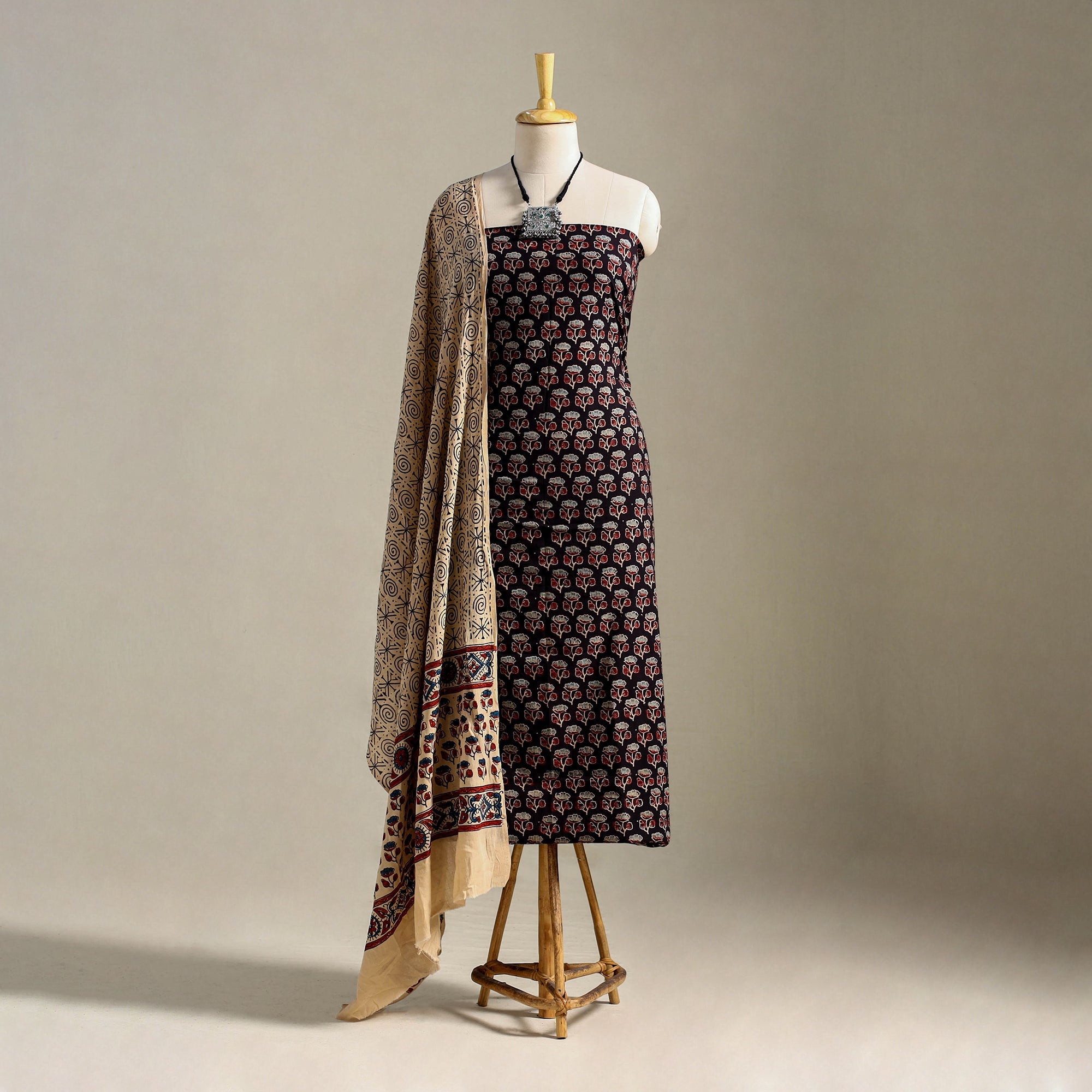 Fine quality black ajrakh hand-block-printed cotton 3pc suit material set from Kutch. This exquisite set is handcrafted with the utmost care and skill, showcasing the traditional ajrakh technique of hand block printing practiced by the skilled artisans in the Kutch region of Gujarat. The intricate patterns and vibrant colors on the cotton fabric create a perfect blend of elegance and comfort, making it ideal for any special occasion.