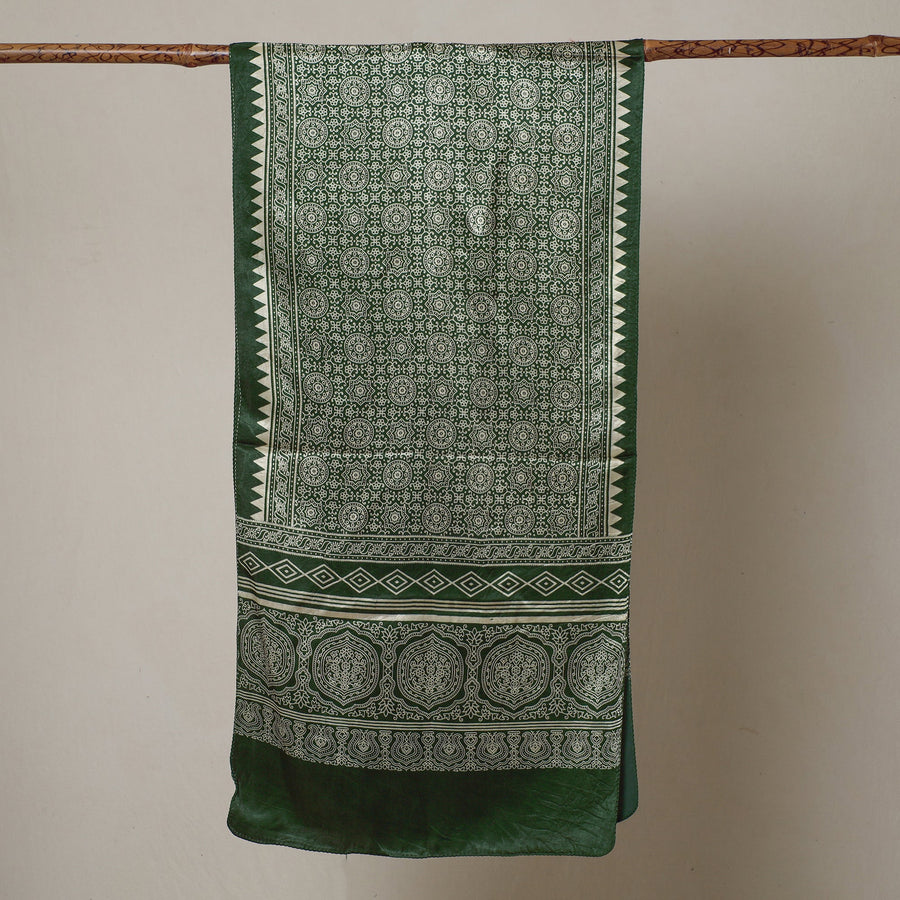 Enhance your ensemble with the green ajrakh-printed mashru silk-cotton stole made by master artisans in the Kutch region of Gujarat. Mashru fabric is made with a mix of silk and cotton threads to create a textile that is simple cotton on one side and has the rich appearance of glistening silk on the other. This intriguing weave technique results in a shiny surface that resembles silk fabric from the outside, with the comfort of cotton on the inner side of the clothing. It has a bright, contrasting texture.