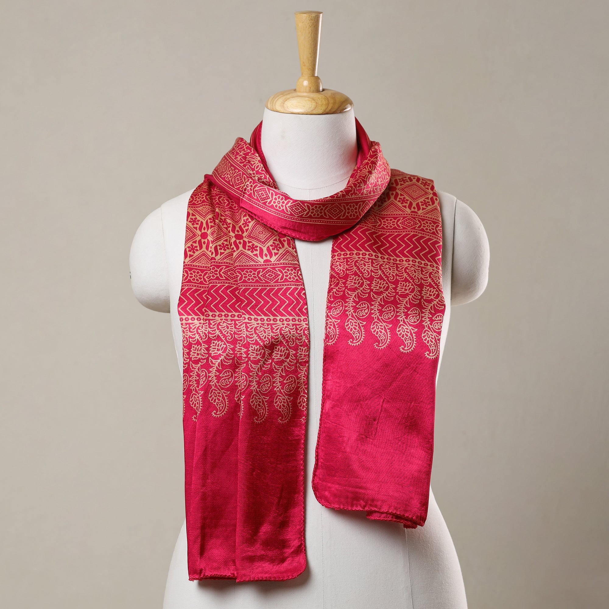 Enhance your ensemble with the ajrakh-printed mashru silk-cotton stole made by master artisans in the Kutch region of Gujarat. Mashru fabric is made with a mix of silk and cotton threads to create a textile that is simple cotton on one side and has the rich appearance of glistening silk on the other. This intriguing weave technique results in a shiny surface that resembles silk fabric from the outside, with the comfort of cotton on the inner side of the clothing. It has a bright, contrasting texture.