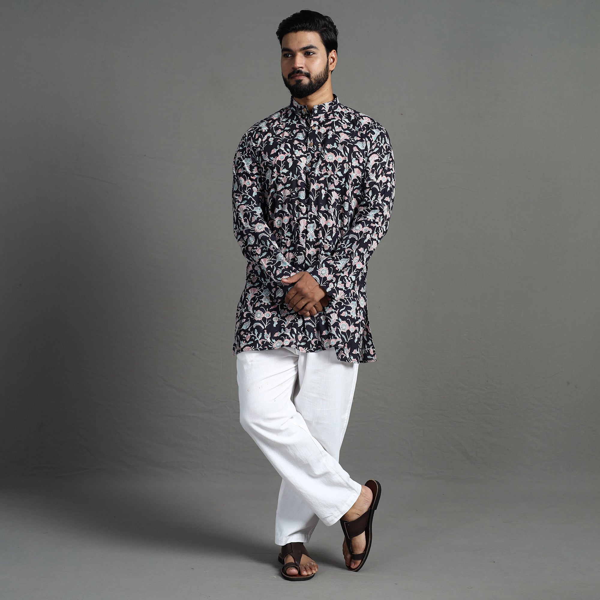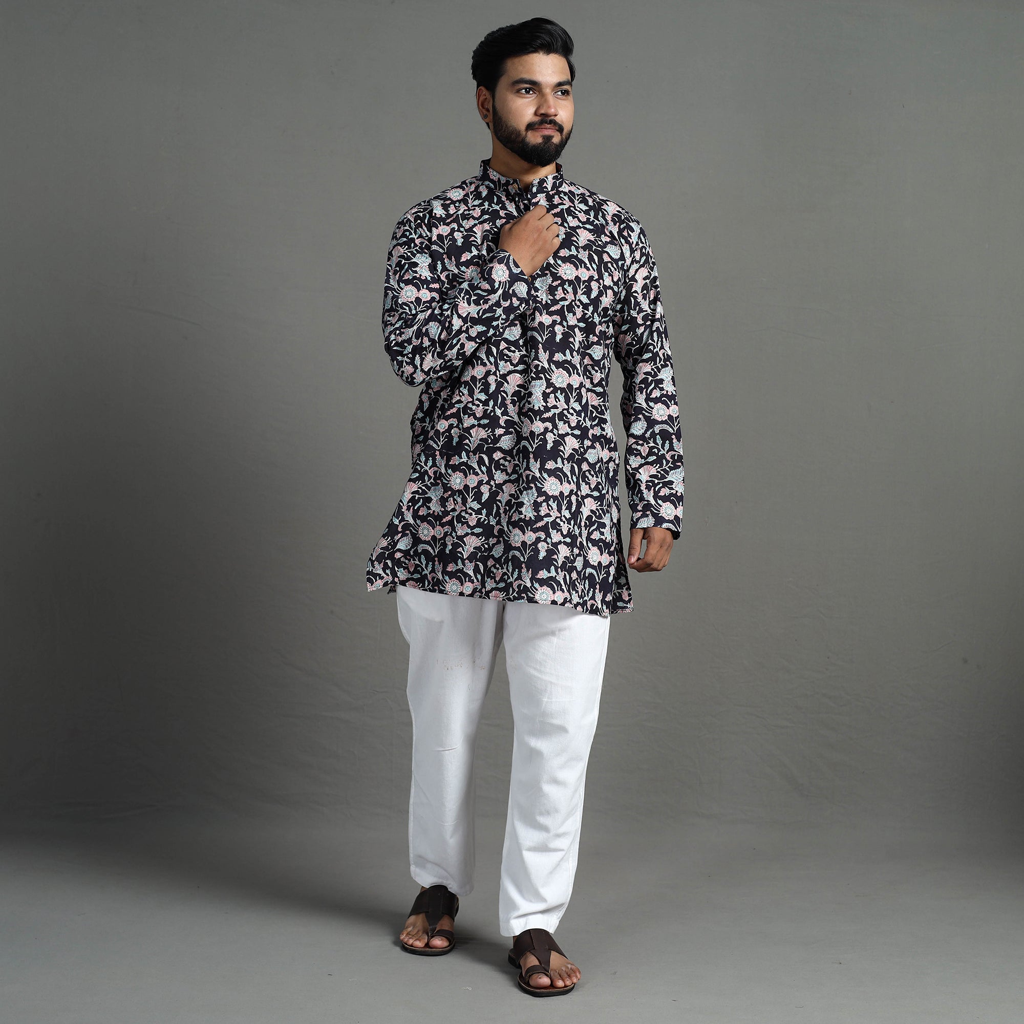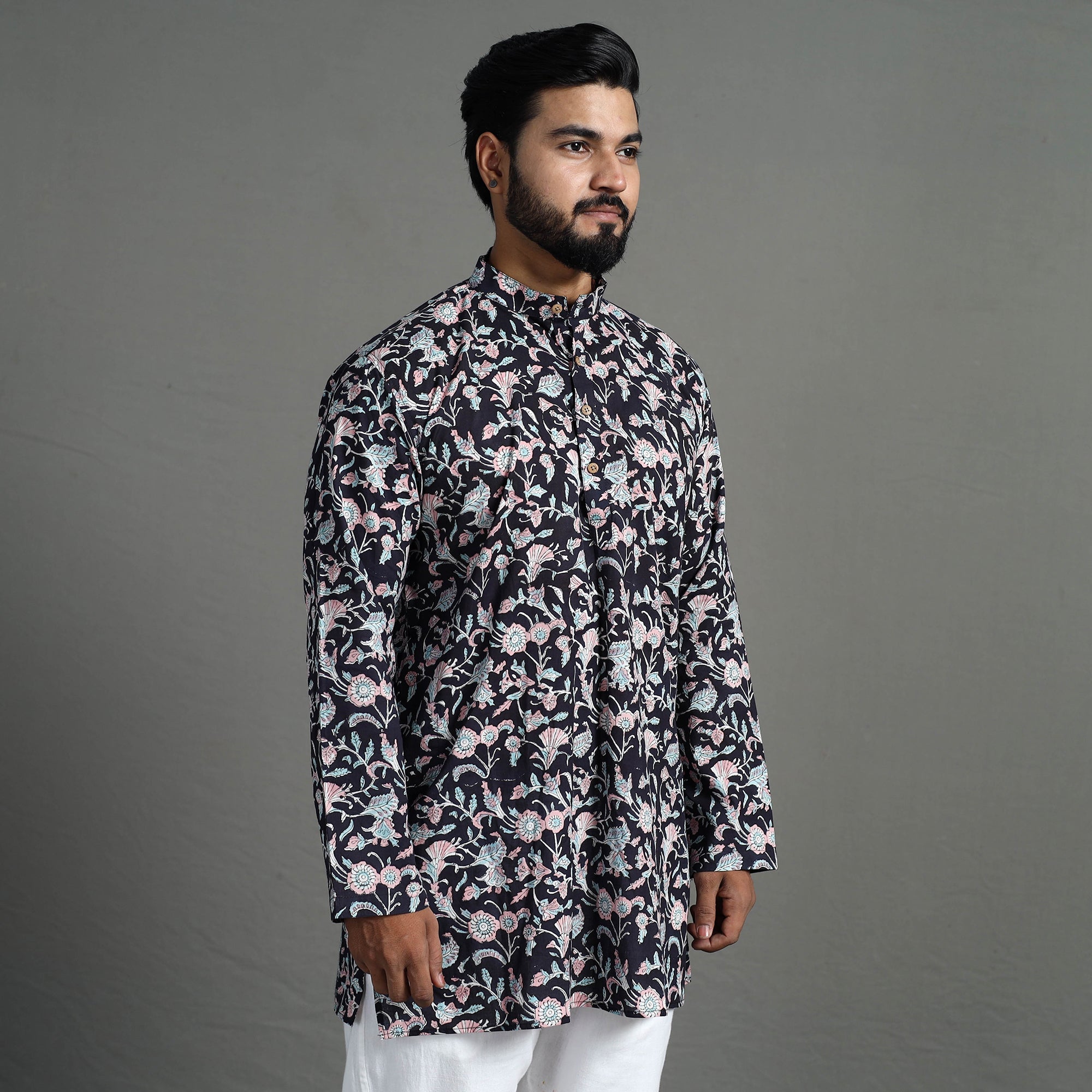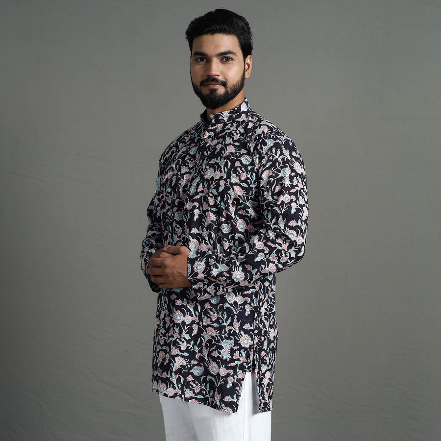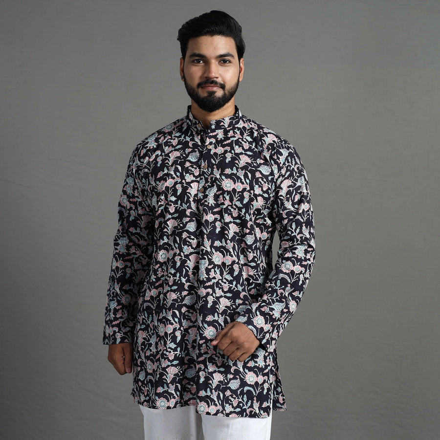 This sanganeri block printed men short kurta offers comfort and ease throughout the days is made using cotton fabric. This fabric ensures a breathable and soft feel, providing the utmost comfort for all-day wear. It has full sleeves a front button placket with chinese collar and convenient two-side pocket for your daily essentials. This kurta is perfect for your daily outings and casual occasions.