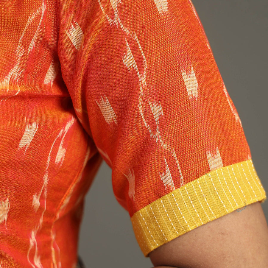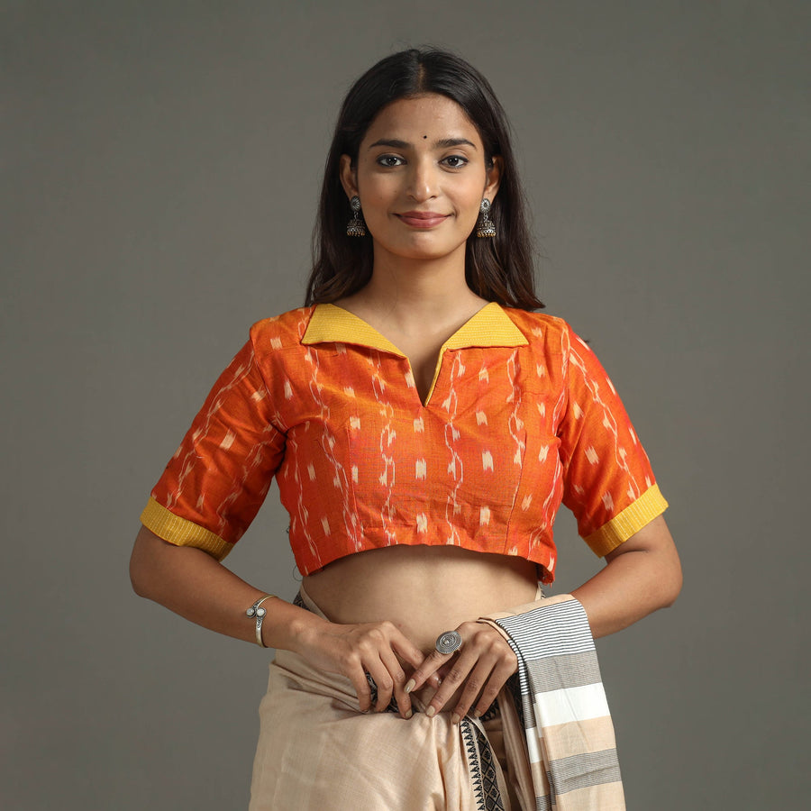 Experience the timeless artistry of sambalpuri Ikat with this handcrafted cotton blouse piece. With versatile mix-and-match styling, this blouse pairs beautifully with a variety of sarees. Elevate your wardrobe with an artisan-crafted cotton-stitched ikat blouse.