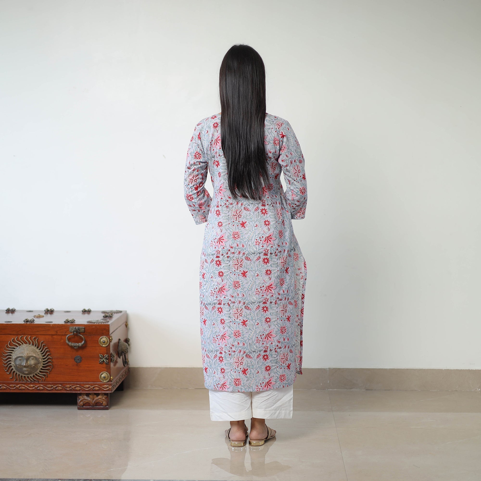 Look and feel beautiful in this uniquely designed grey sanganeri block-printed cotton straight kurta. This exquisite kurta is crafted from fine-quality cotton fabric, ensuring a comfortable feel against your skin. The kurta also features a convenient one-side pocket, perfect for carrying small essentials. This cotton kurta makes you comfortable all day long. This kurta is perfect for your daily outing and for a special occasion.