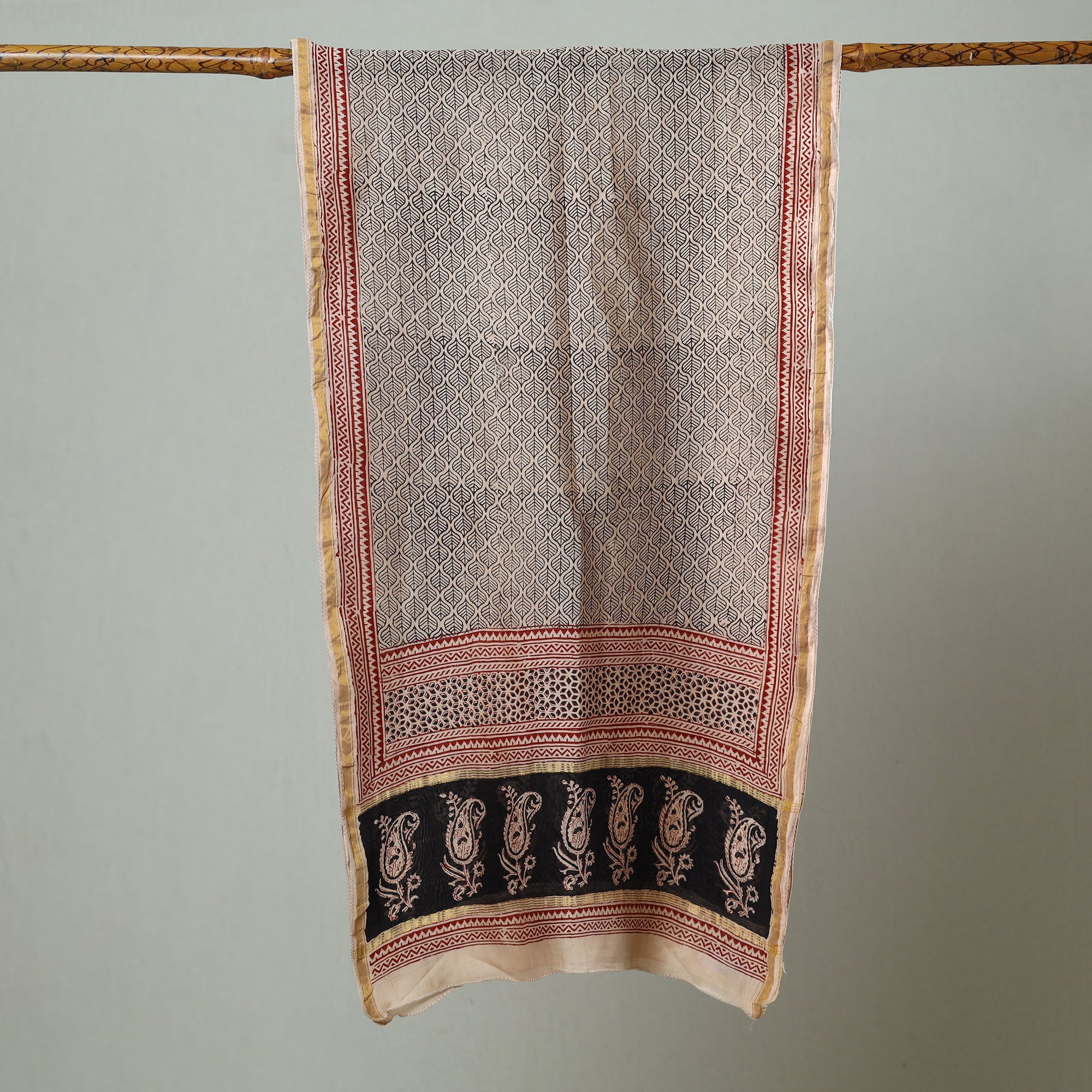 Elevate your style with the special black bagh block-printed chanderi silk cotton stole crafted by the skilled artisan Mohammed Bilal Khatri. This stole is a masterpiece created using natural dyes and the traditional handblock printing technique practiced in Bagh, Madhya Pradesh. The stole showcases the beauty of natural dye and adds a touch of elegance to your everyday attire, leaving a lasting impression wherever you go.