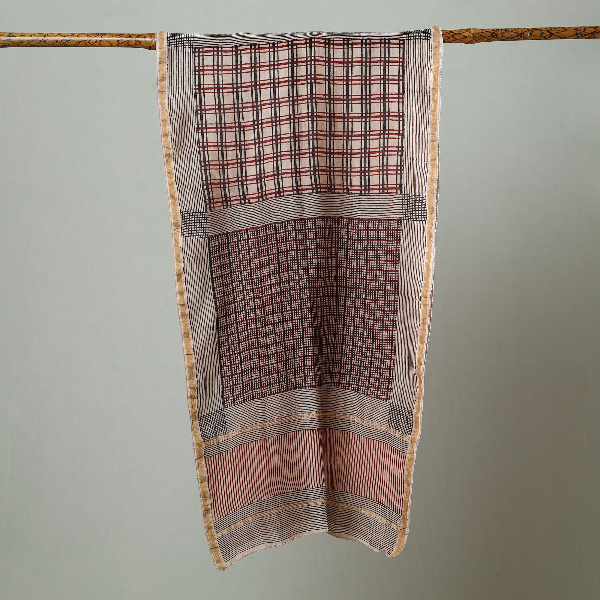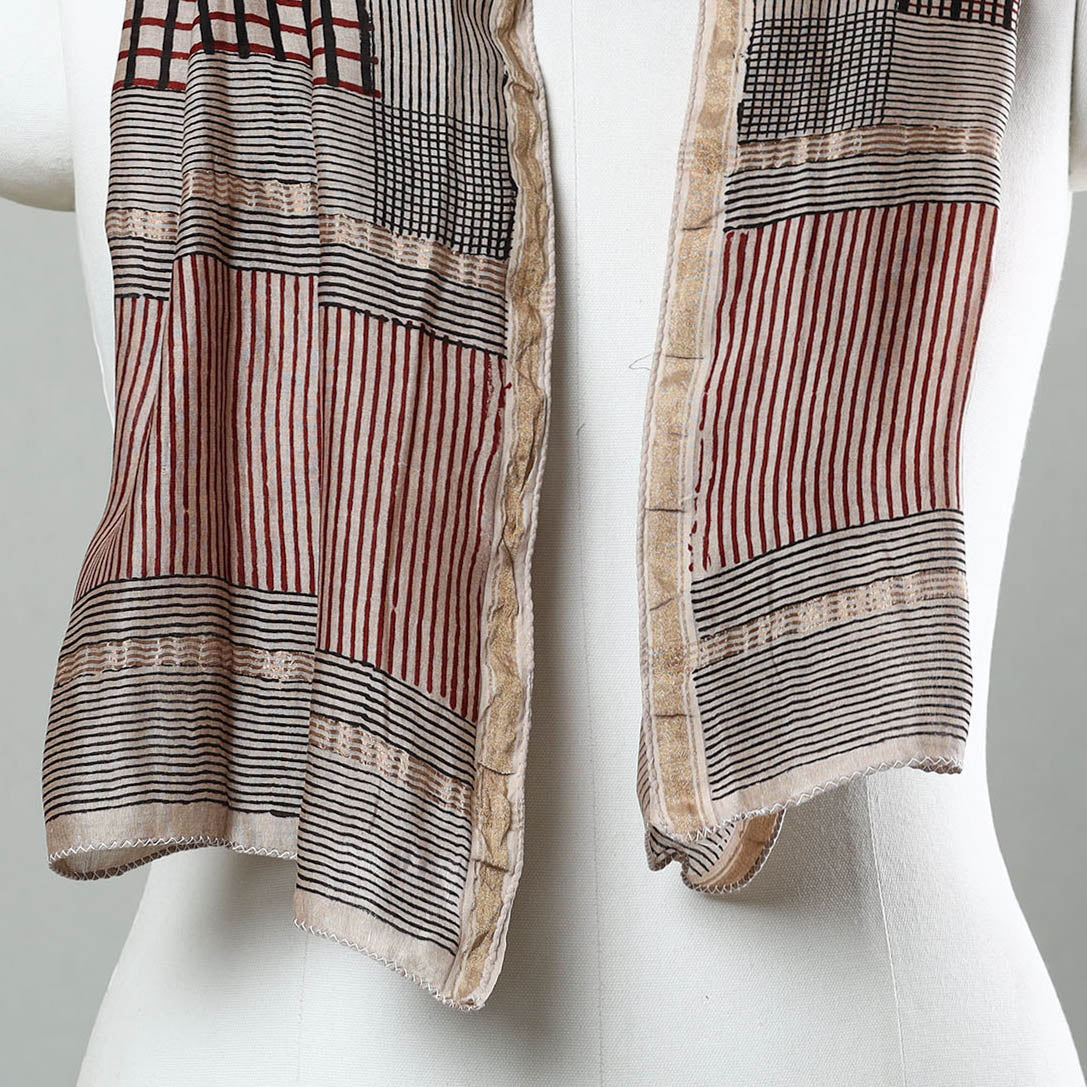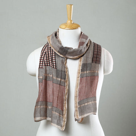 Elevate your style with the special black bagh block-printed chanderi silk cotton stole crafted by the skilled artisan Mohammed Bilal Khatri. This stole is a masterpiece created using natural dyes and the traditional handblock printing technique practiced in Bagh, Madhya Pradesh. The stole showcases the beauty of natural dye and adds a touch of elegance to your everyday attire, leaving a lasting impression wherever you go.