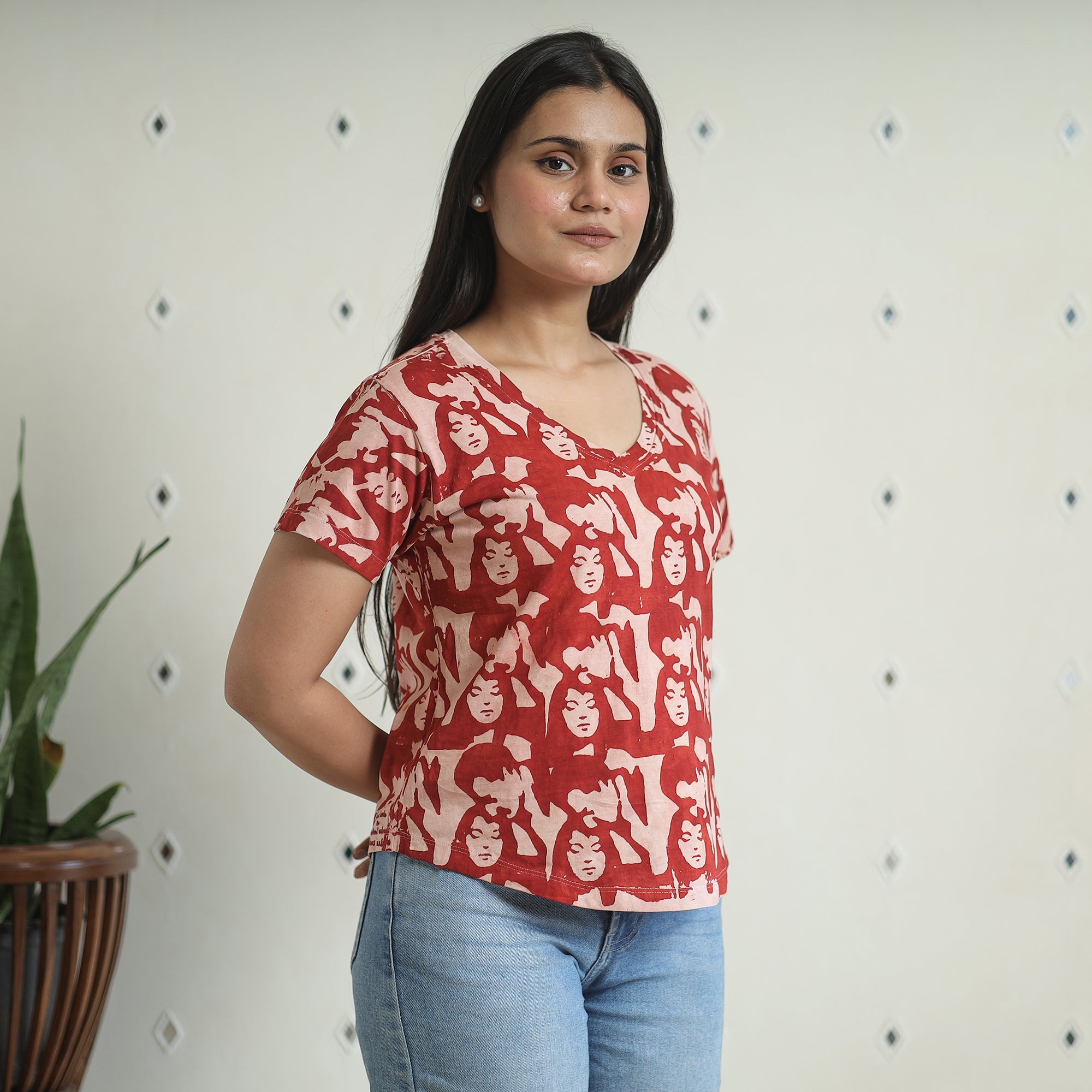 Elevate your style with this exquisite, fine quality bindaas hand block printed cotton women v neck T-shirt! Made by skilled fourth-generation textile printers in Rajasthan, this t-shirt features contemporary designs created through traditional processes. The natural dyes and hand block printing give it a unique, artisanal look. With a modern aesthetic and design, this slow fashion t-shirt is perfect for those who appreciate traditional skills. It's comfortable, breathable, and versatile, making it a great addition to any wardrobe. To make these t-shirts it takes: a hundred year old technique, 15-22 processes, 25-40 pairs of hands, 65 hours spread over, at least 12 days, a lot of sun and sand!