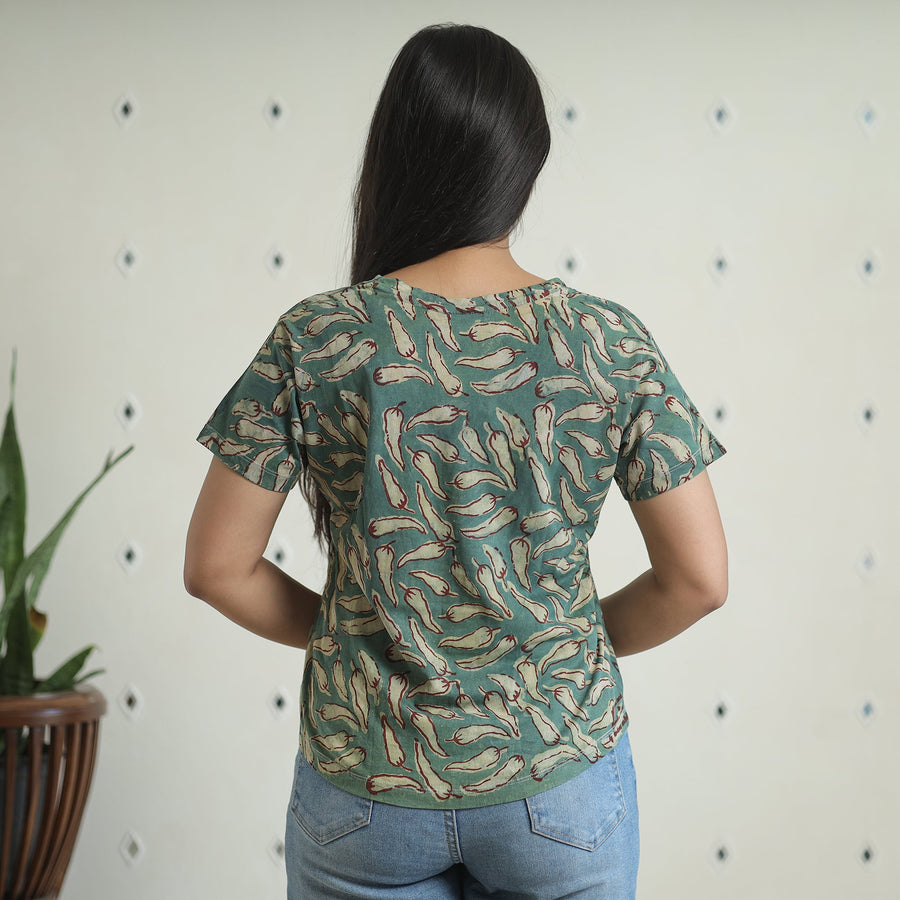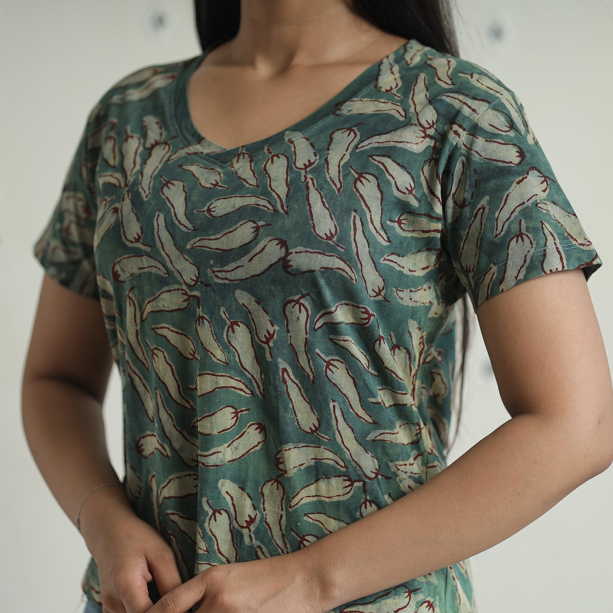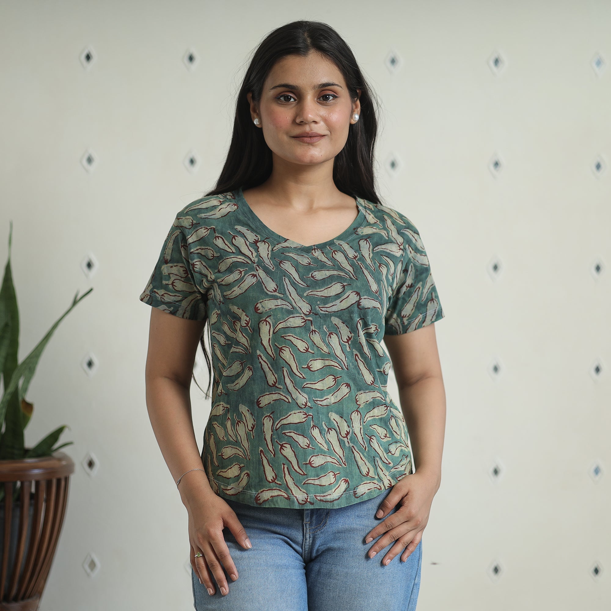 Elevate your style with this exquisite, fine quality bindaas hand block printed cotton women v neck T-shirt! Made by skilled fourth-generation textile printers in Rajasthan, this t-shirt features contemporary designs created through traditional processes. The natural dyes and hand block printing give it a unique, artisanal look. With a modern aesthetic and design, this slow fashion t-shirt is perfect for those who appreciate traditional skills. It's comfortable, breathable, and versatile, making it a great addition to any wardrobe. To make these t-shirts it takes: a hundred year old technique, 15-22 processes, 25-40 pairs of hands, 65 hours spread over, at least 12 days, a lot of sun and sand!