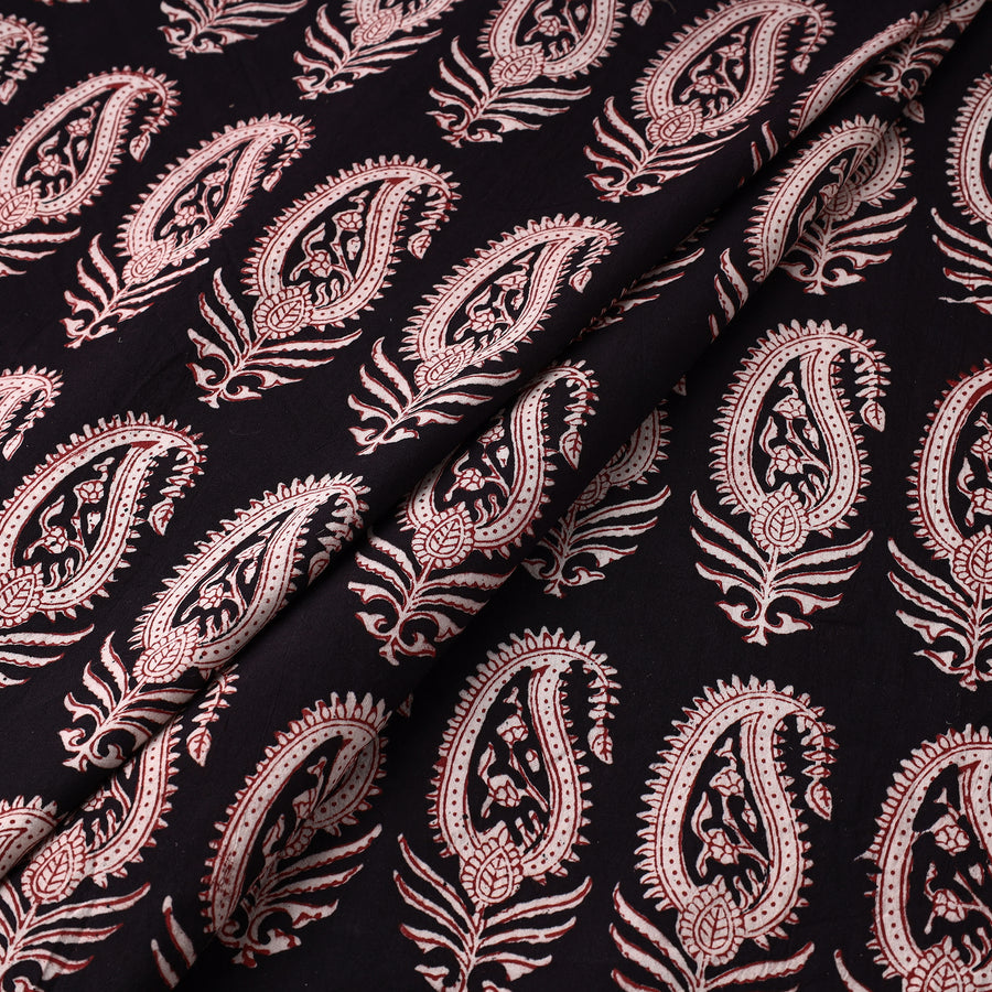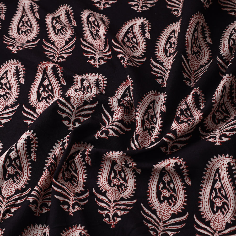 This fine-quality black bagh hand block-printed cotton fabric is made using natural dyes through traditional processes by master artisan Umar Faruk Khatri, practiced in Bagh, the Dhar district of Madhya Pradesh. The intricate and unique patterns make this fabric a perfect choice for a variety of projects.