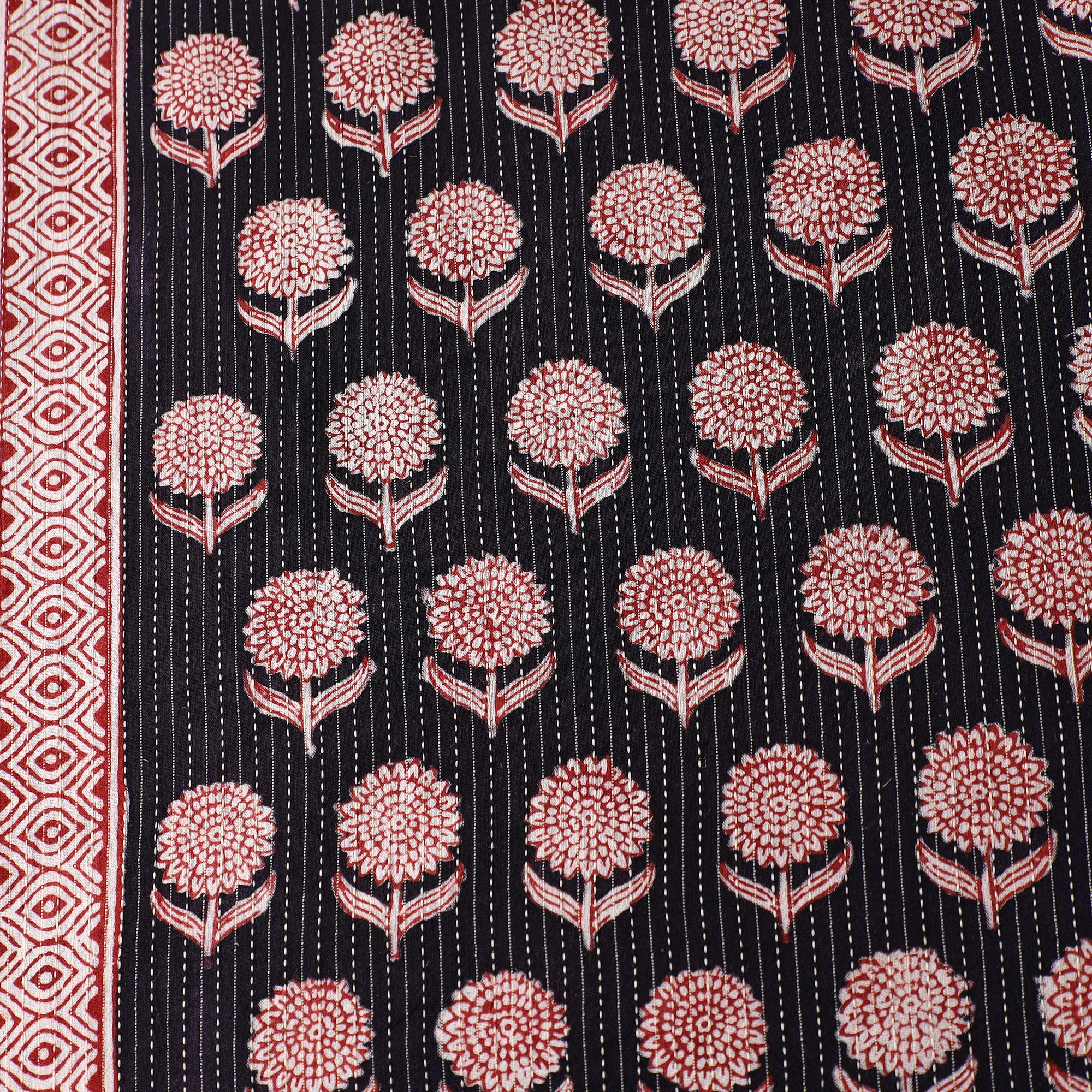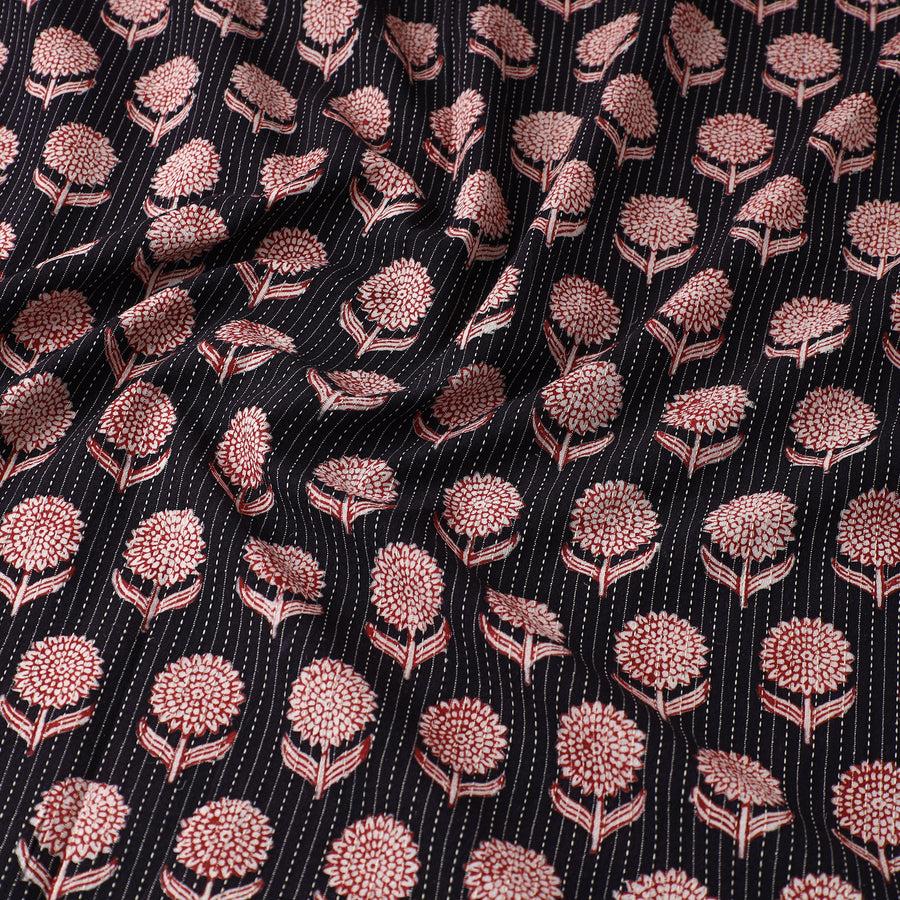 Fine quality black bagh block printed Kantha-style cotton fabric, made using natural dyes through traditional process of hand block printing by Umar Faruk Khatri, practiced in Bagh, the Dhar district of Madhya Pradesh. This fabric is perfect for creating stylish garments, home decor, and accessories that reflect cultural heritage and contemporary flair.