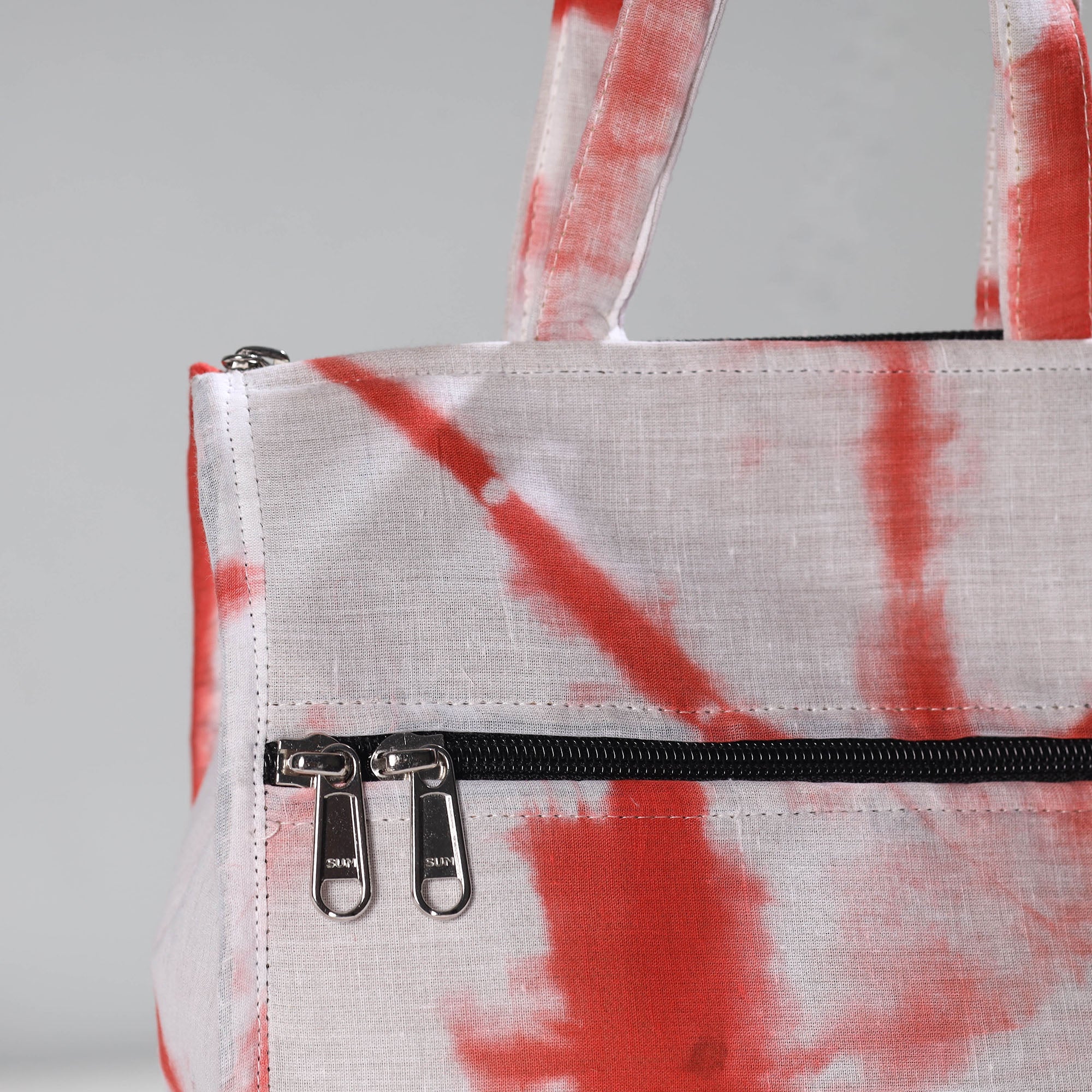 Experience timeless beauty with our red handcrafted shibori tie-dye cotton hand bag. The carefully crafted, intricate shibori tie-dye pattern exudes sophistication. Perfect for daily use, it offers ample space for essentials, as well as an internal zipped pocket and a convenient front pocket, which makes it a stylish and functional accessory.