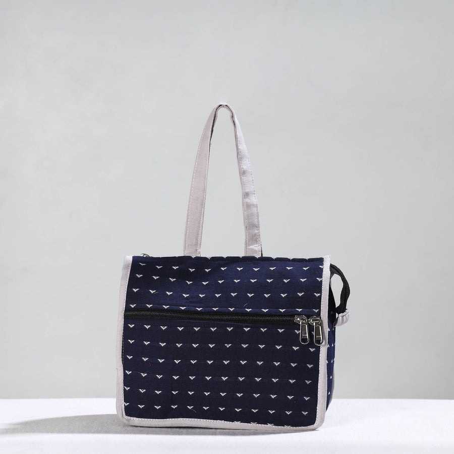 Experience timeless beauty with our blue handcrafted jacquard cotton hand bag. The carefully crafted, intricate jacquard pattern exudes sophistication. Perfect for daily use, it offers ample space for essentials, as well as an internal zipped pocket and a convenient front pocket, which makes it a stylish and functional accessory.