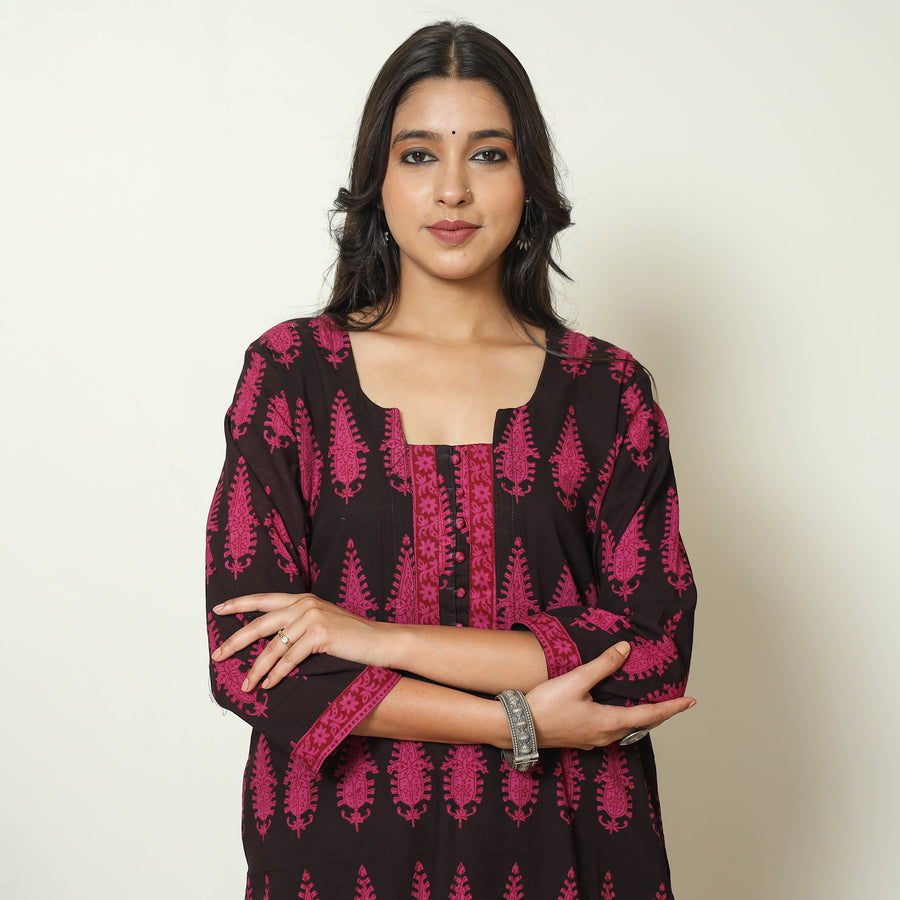 This bagh block-printed cotton stitched kurta with palazzo & dupatta set is the perfect blend of comfort and style. This suit set is made of natural-dyed fabric. This kurta set is crafted from cotton fabric, ensuring a comfortable feel against your skin. The kurta also features a convenient one-side pocket, perfect for carrying small essentials, and the palazzo features an elasticized waist and two side pockets, adding functionality to this palazzo. Perfect for special occasions, this suit set combines fashion and functionality effortlessly, ensuring you look and feel beautiful with ease.