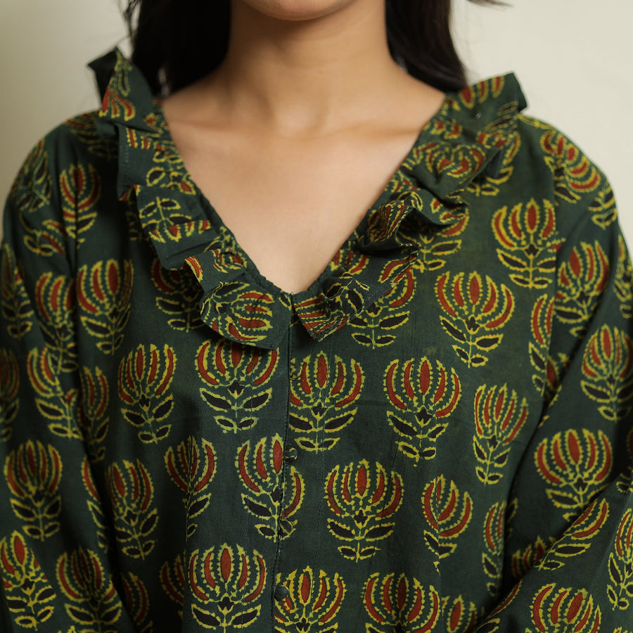 Look and feel beautiful in this uniquely designed green ajrakh hand-block printed crop top featuring full sleeves. Crafted from cotton fabric and using natural dyes, this crop top is comfortable for all-day wear. Its design makes it perfect for daily outings and special occasions alike.