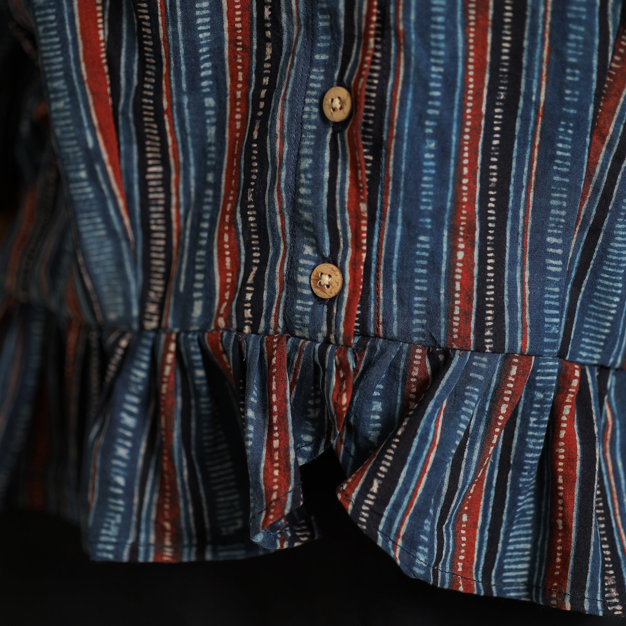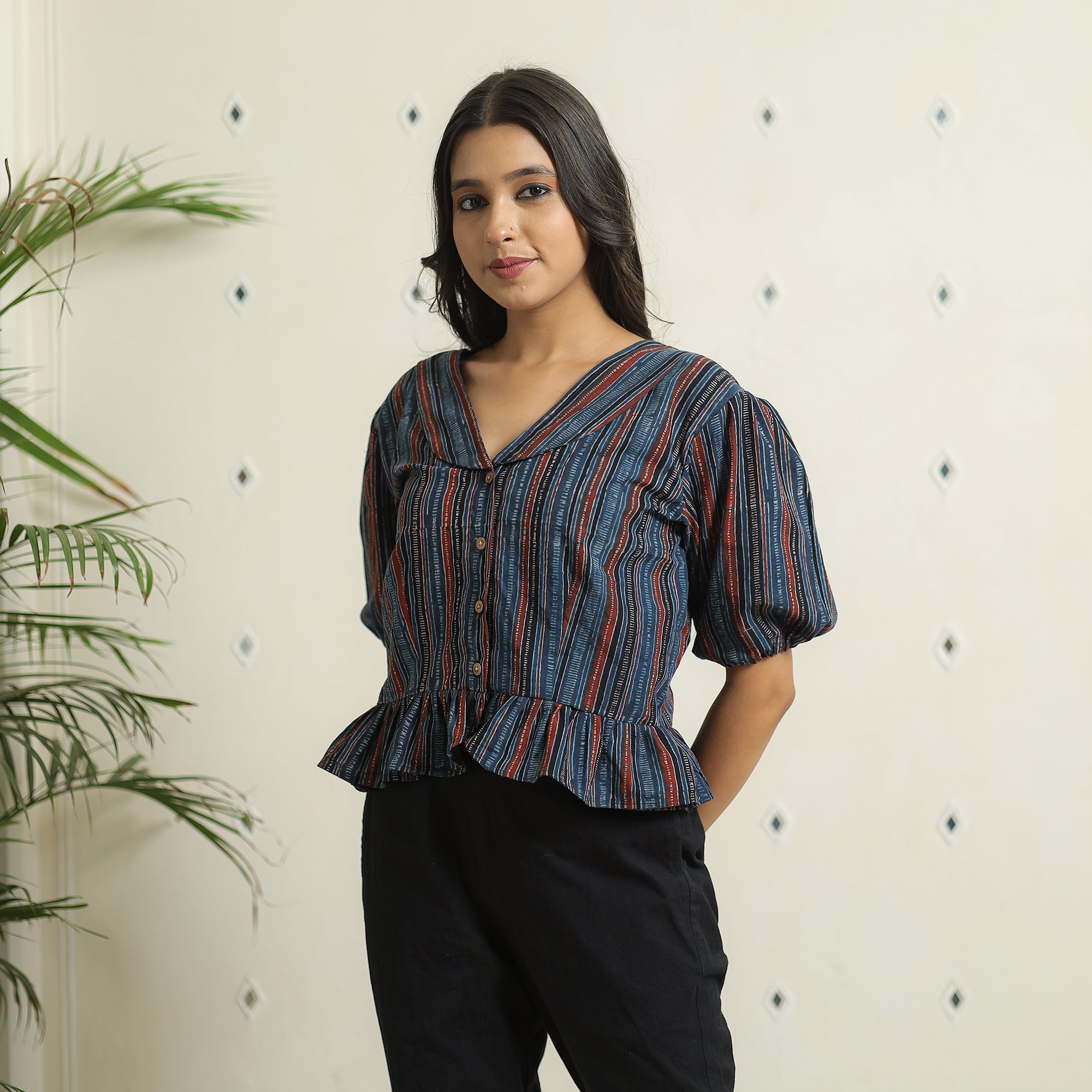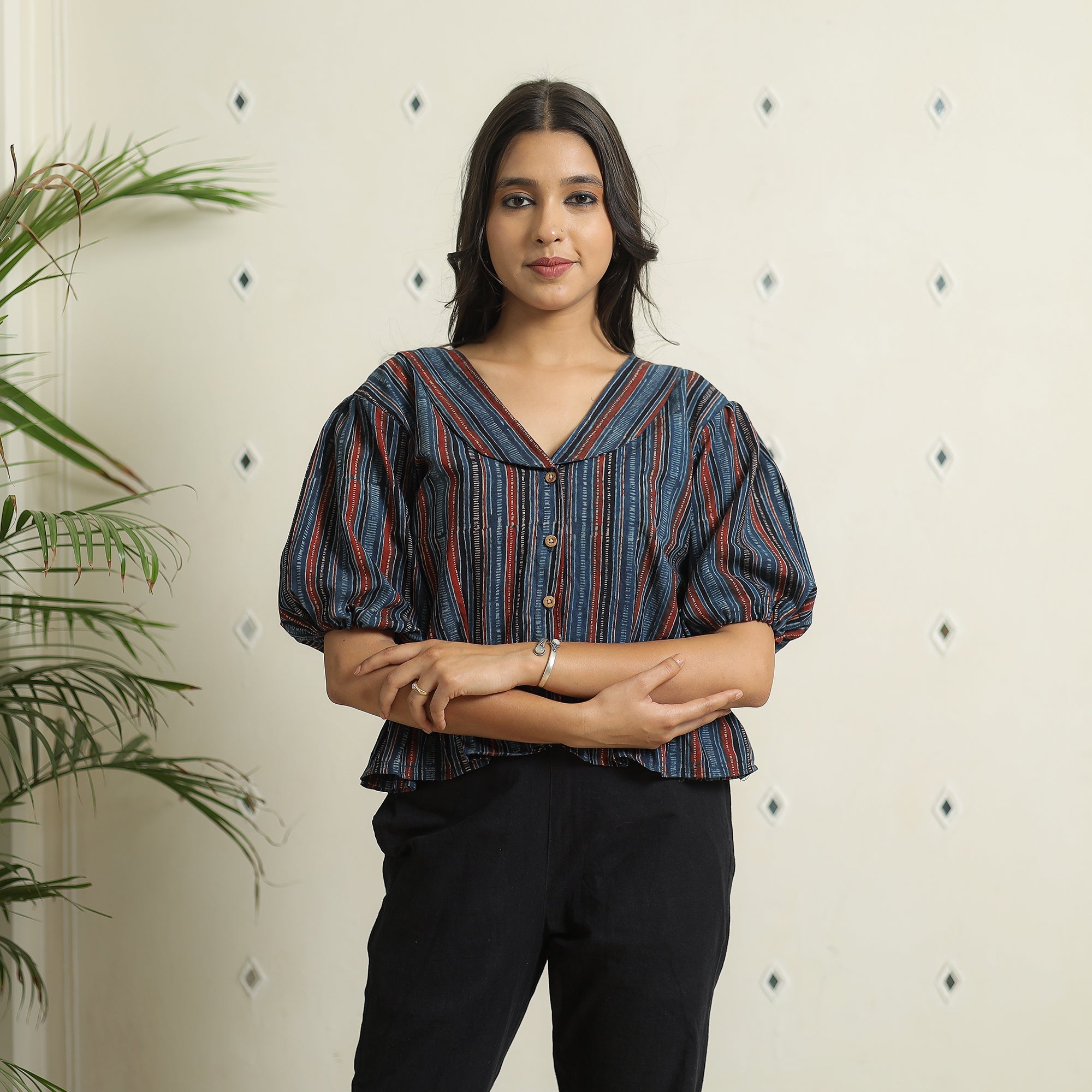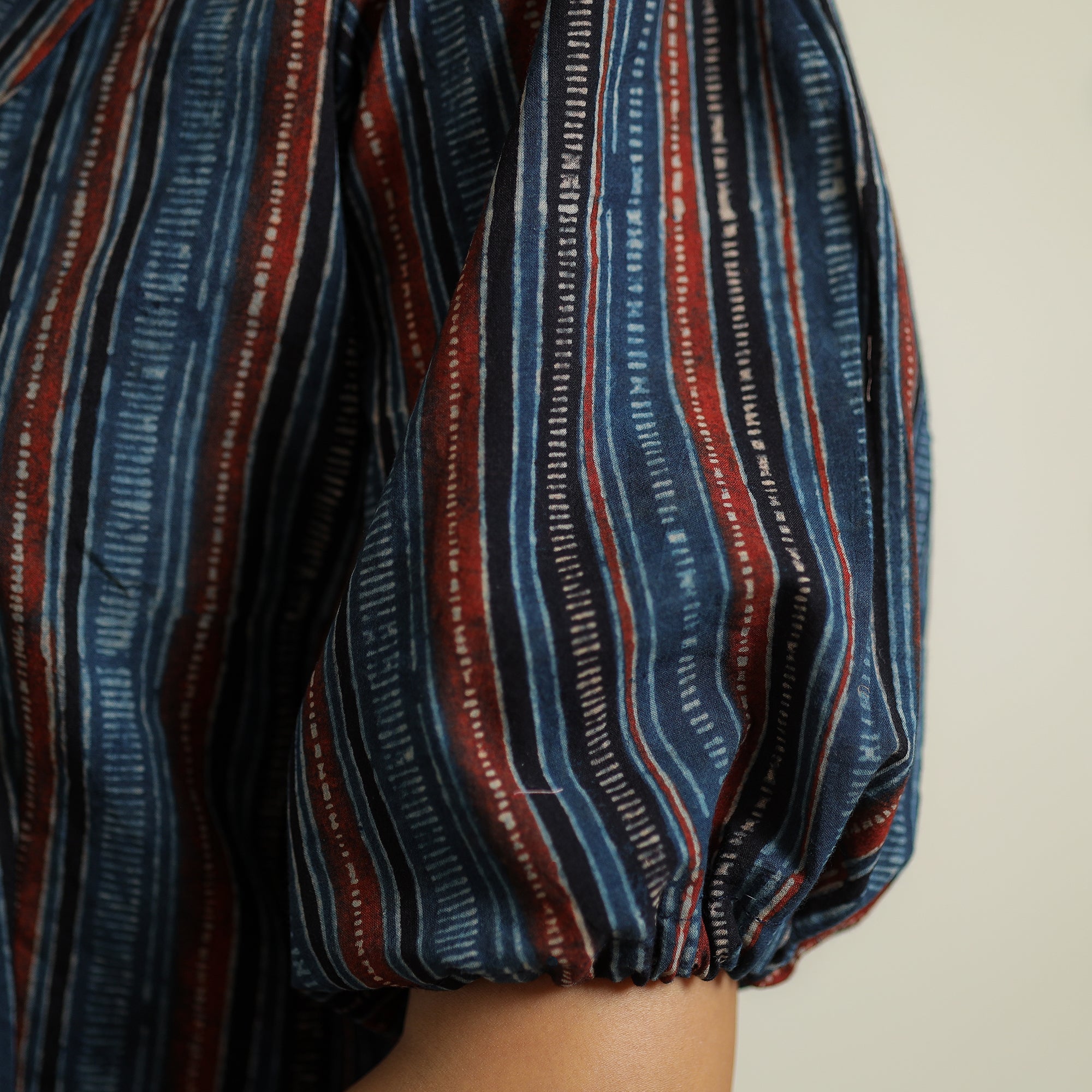 Look and feel beautiful in this uniquely designed blue ajrakh hand-block printed crop top featuring 3/4 sleeves. Crafted from cotton fabric and using natural dyes, this crop top is comfortable for all-day wear. Its design makes it perfect for daily outings and special occasions alike.