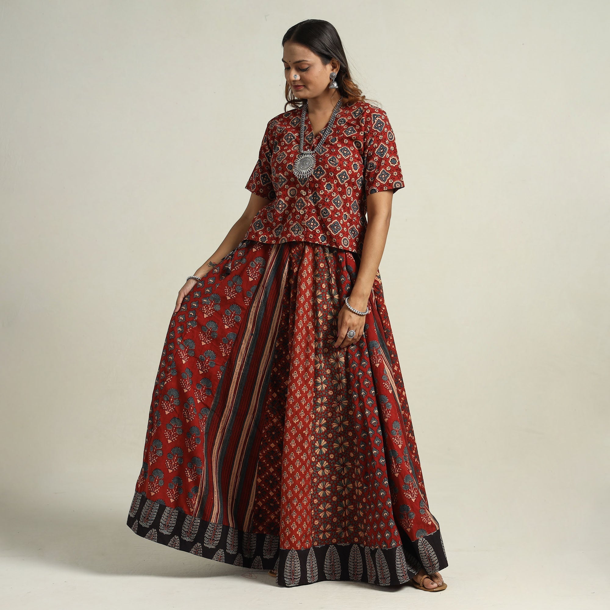 Elevate your wardrobe with our red patchwork long skirt, skillfully crafted from ajrakh block-printed, natural-dyed cotton fabric. This skirt boasts a waist tie-up closure, allowing for a customized and comfortable fit. The patchwork kali design adds a unique touch, showcasing the skilled craftsmanship behind its creation. The natural dyes used in the printing process enhance the overall beauty of the garment. The intricate patterns and vibrant colors reflect the cultural heritage of Gujarat. Perfect for both casual and semi-formal occasions.