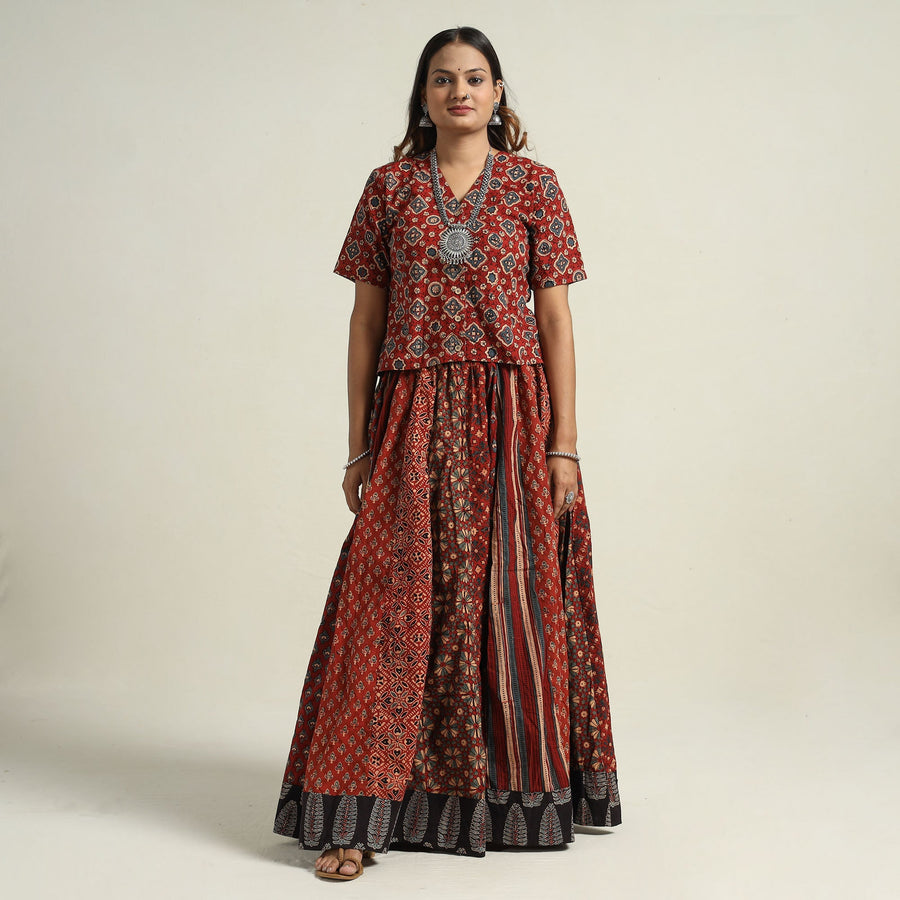 Elevate your wardrobe with our red patchwork long skirt, skillfully crafted from ajrakh block-printed, natural-dyed cotton fabric. This skirt boasts a waist tie-up closure, allowing for a customized and comfortable fit. The patchwork kali design adds a unique touch, showcasing the skilled craftsmanship behind its creation. The natural dyes used in the printing process enhance the overall beauty of the garment. The intricate patterns and vibrant colors reflect the cultural heritage of Gujarat. Perfect for both casual and semi-formal occasions.