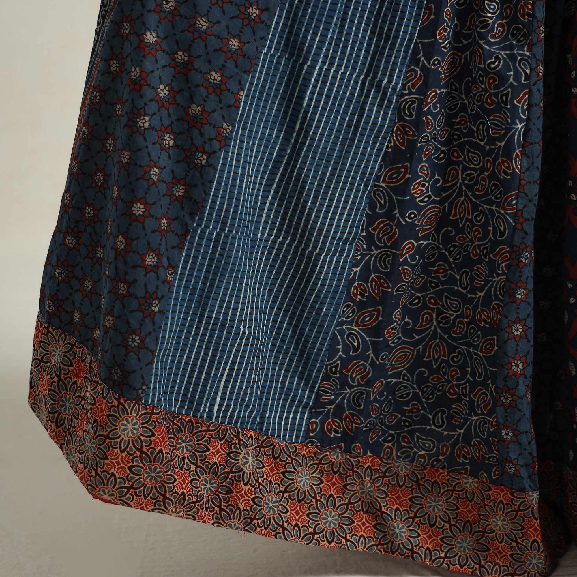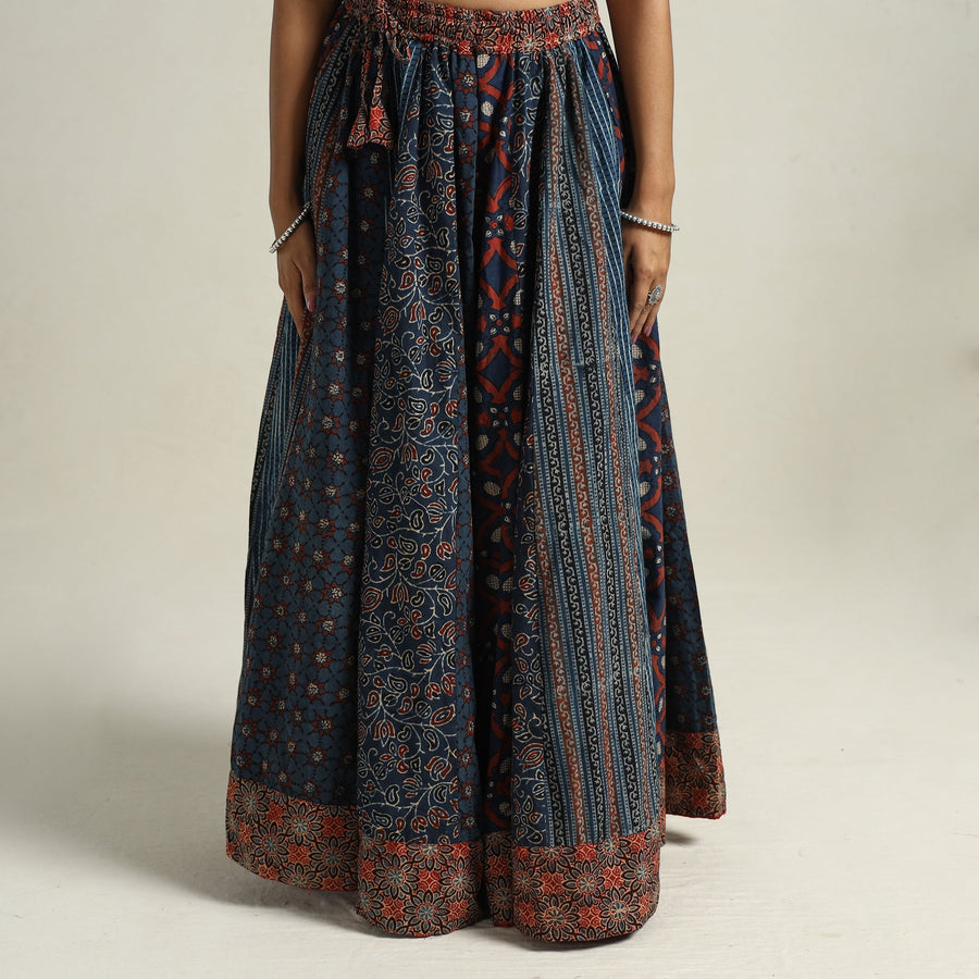 Elevate your wardrobe with our blue patchwork long skirt, skillfully crafted from ajrakh block-printed, natural-dyed cotton fabric. This skirt boasts a waist tie-up closure, allowing for a customized and comfortable fit. The patchwork kali design adds a unique touch, showcasing the skilled craftsmanship behind its creation. The natural dyes used in the printing process enhance the overall beauty of the garment. The intricate patterns and vibrant colors reflect the cultural heritage of Gujarat. Perfect for both casual and semi-formal occasions.