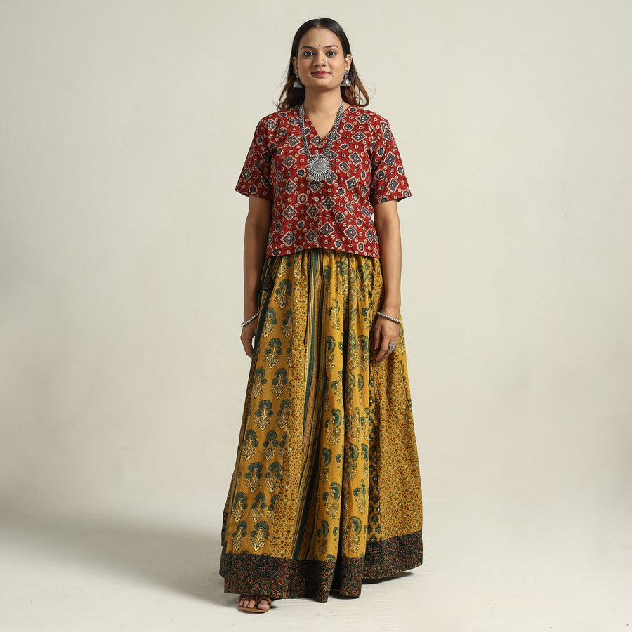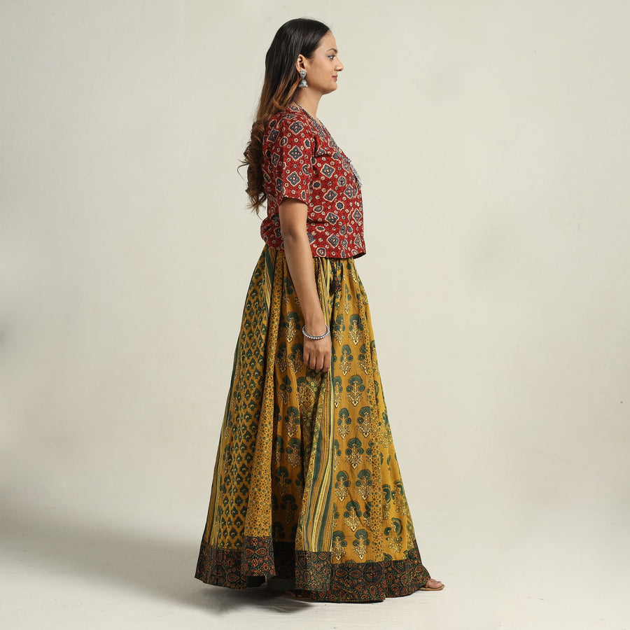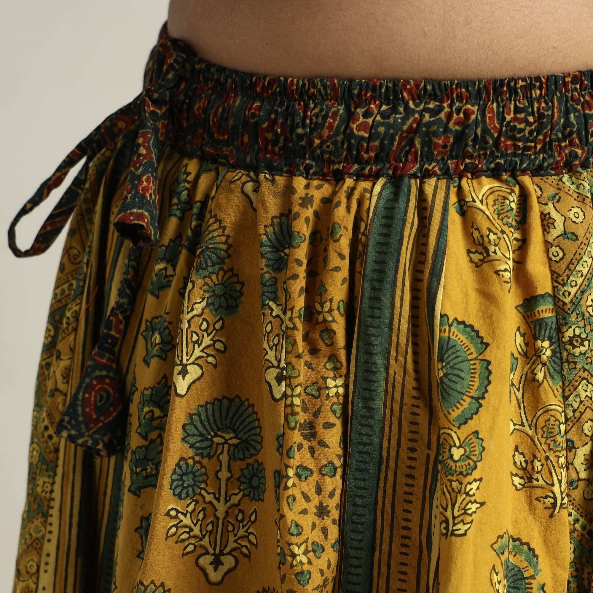 Elevate your wardrobe with our yellow patchwork long skirt, skillfully crafted from ajrakh block-printed, natural-dyed cotton fabric. This skirt boasts a waist tie-up closure, allowing for a customized and comfortable fit. The patchwork kali design adds a unique touch, showcasing the skilled craftsmanship behind its creation. The natural dyes used in the printing process enhance the overall beauty of the garment. The intricate patterns and vibrant colors reflect the cultural heritage of Gujarat. Perfect for both casual and semi-formal occasions.