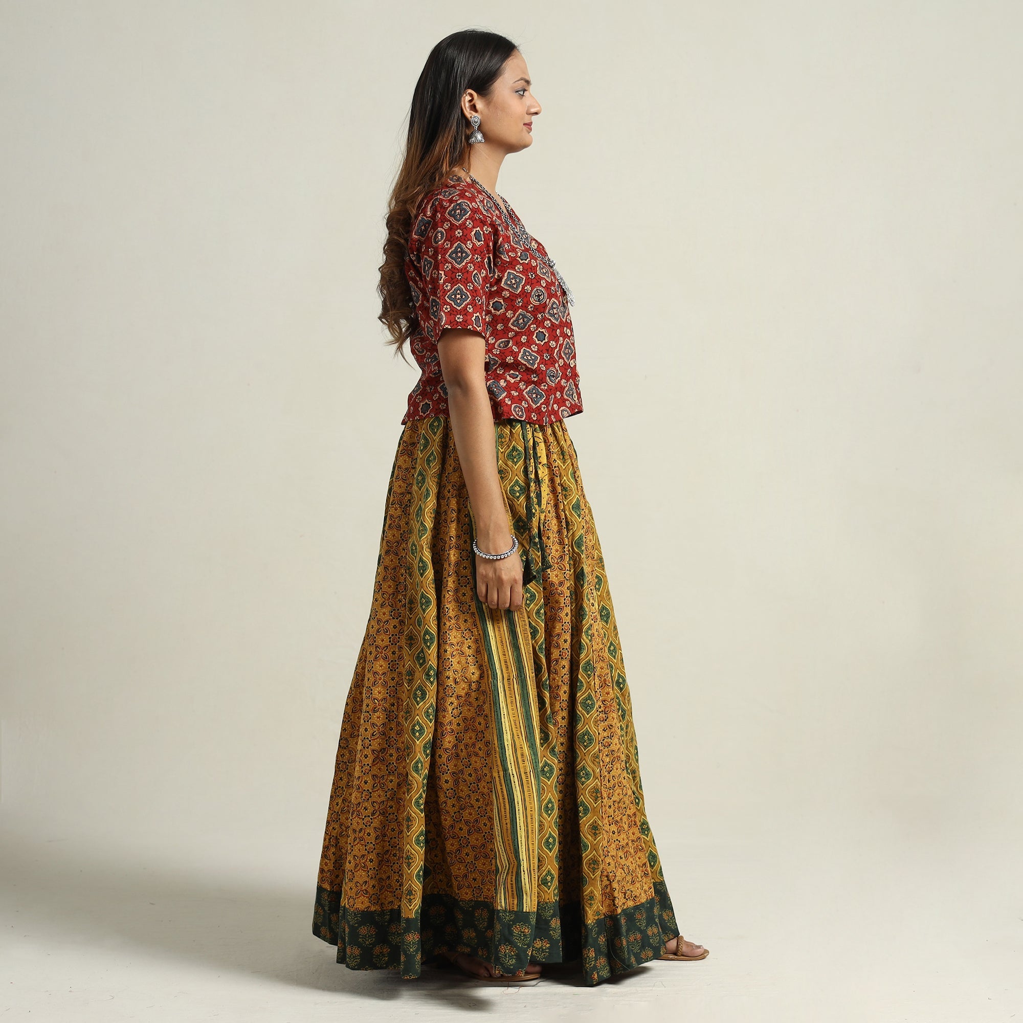 Elevate your wardrobe with our yellow patchwork long skirt, skillfully crafted from ajrakh block-printed, natural-dyed cotton fabric. This skirt boasts a waist tie-up closure, allowing for a customized and comfortable fit. The patchwork kali design adds a unique touch, showcasing the skilled craftsmanship behind its creation. The natural dyes used in the printing process enhance the overall beauty of the garment. The intricate patterns and vibrant colors reflect the cultural heritage of Gujarat. Perfect for both casual and semi-formal occasions.