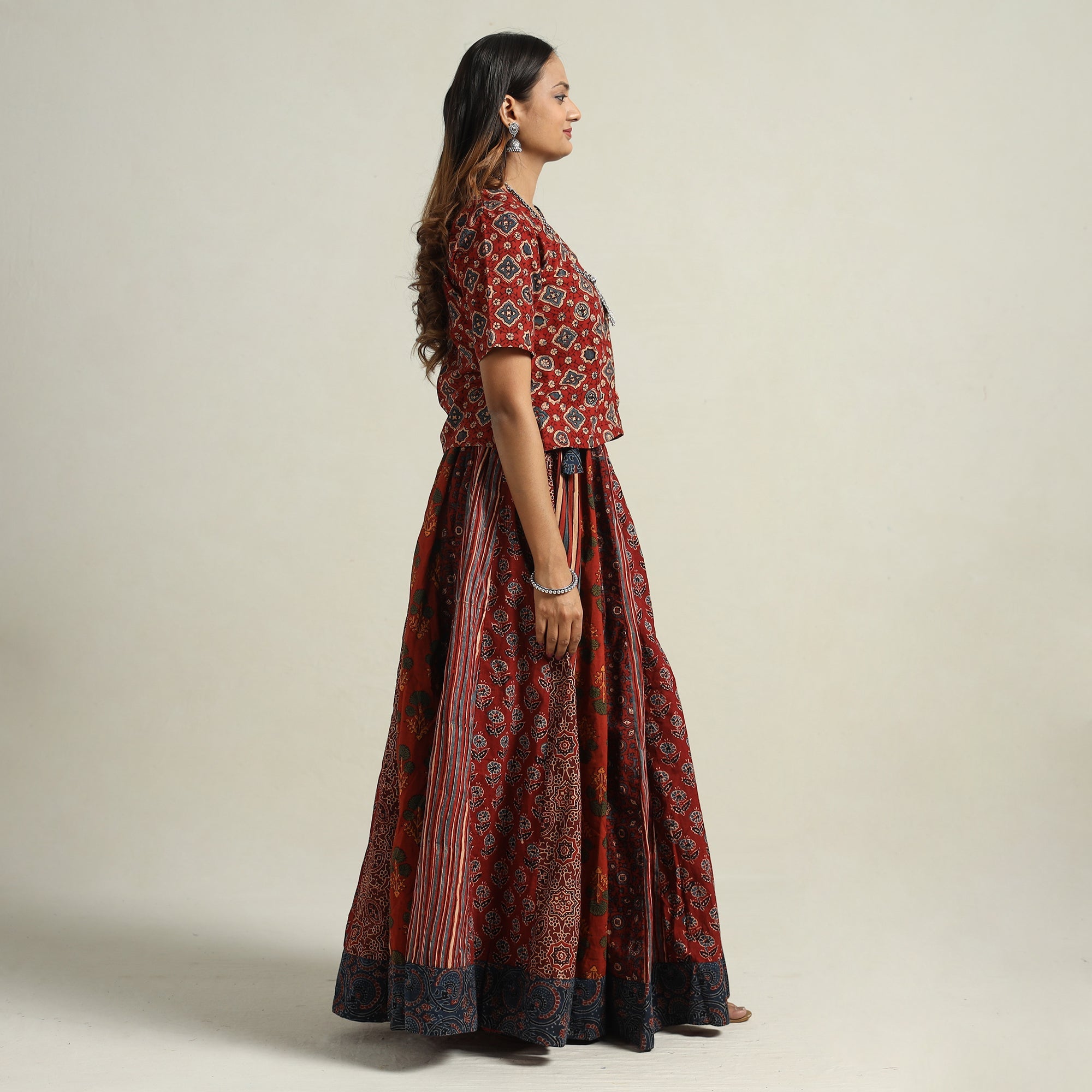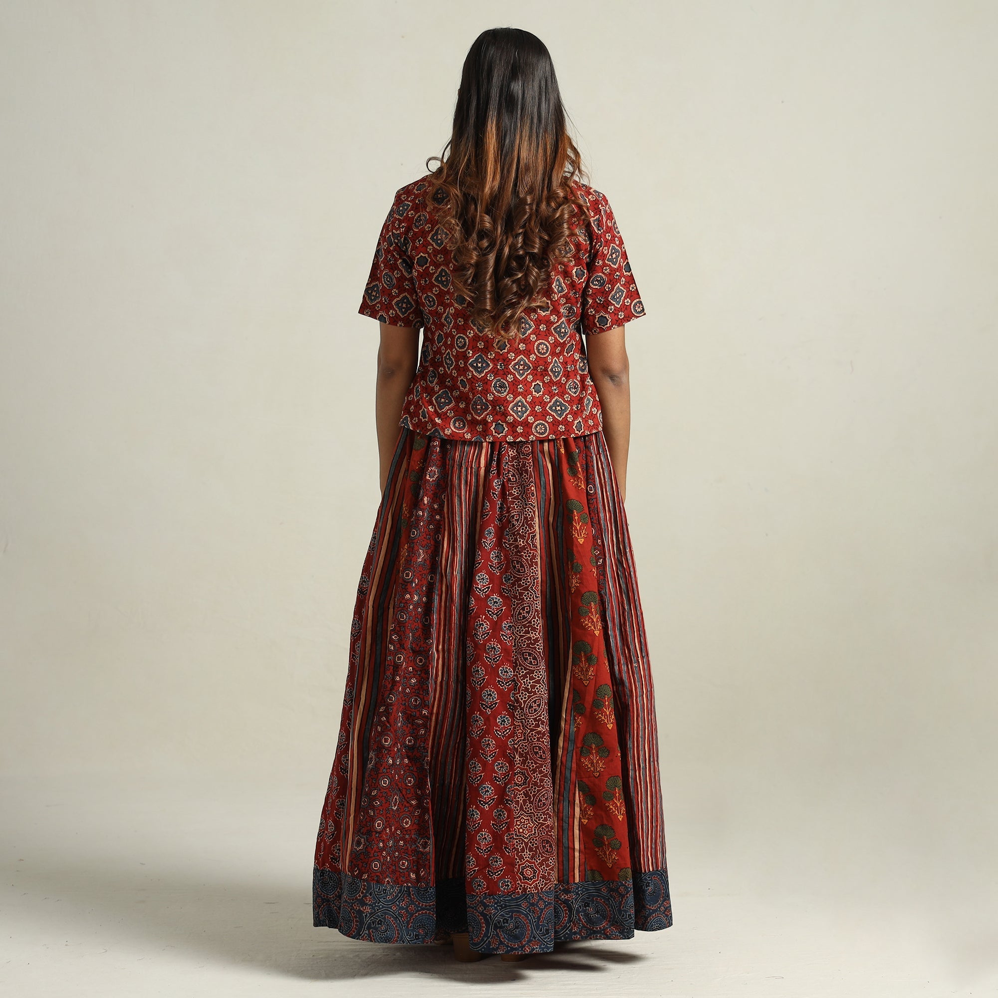 Elevate your wardrobe with our red patchwork long skirt, skillfully crafted from ajrakh block-printed, natural-dyed cotton fabric. This skirt boasts a waist tie-up closure, allowing for a customized and comfortable fit. The patchwork kali design adds a unique touch, showcasing the skilled craftsmanship behind its creation. The natural dyes used in the printing process enhance the overall beauty of the garment. The intricate patterns and vibrant colors reflect the cultural heritage of Gujarat. Perfect for both casual and semi-formal occasions.