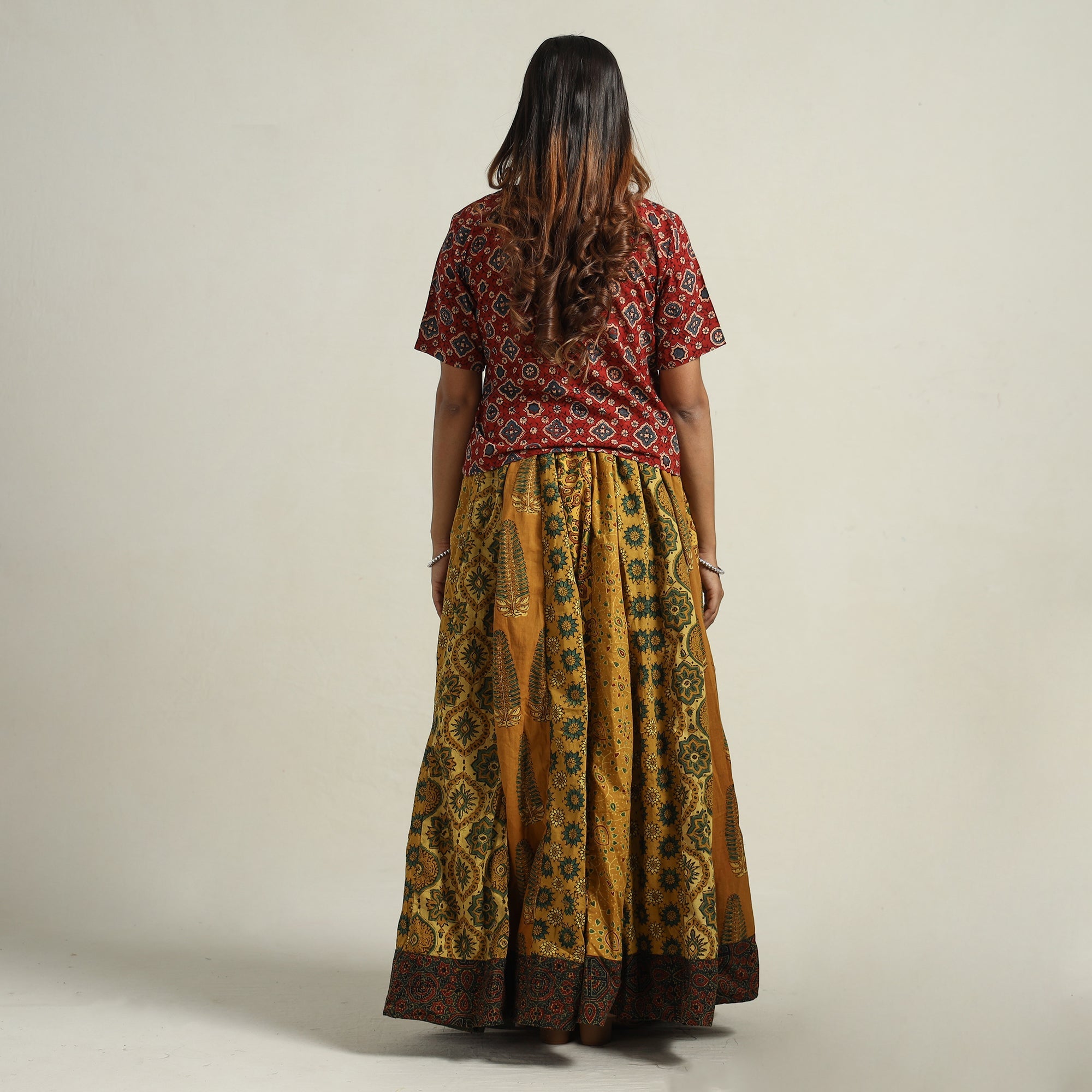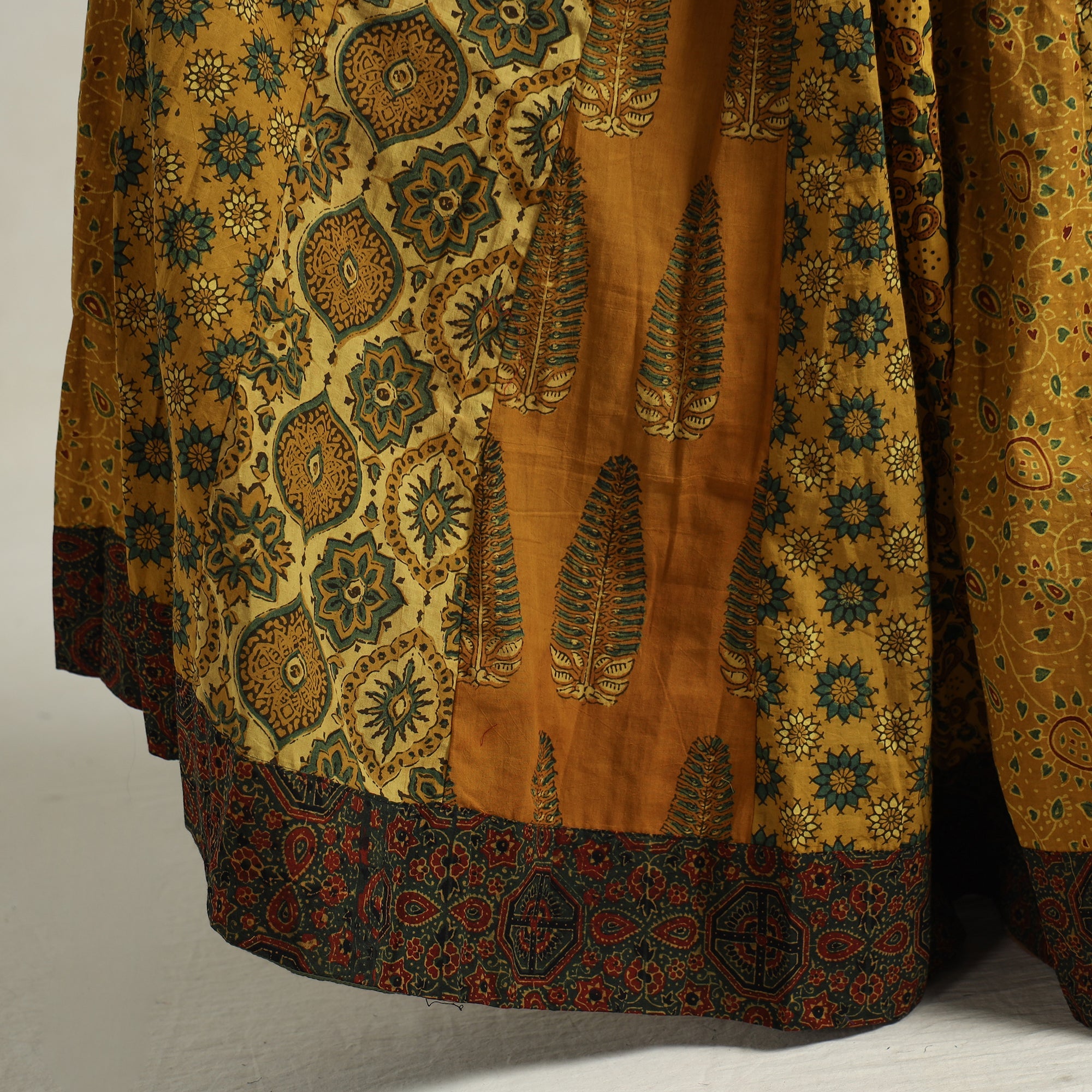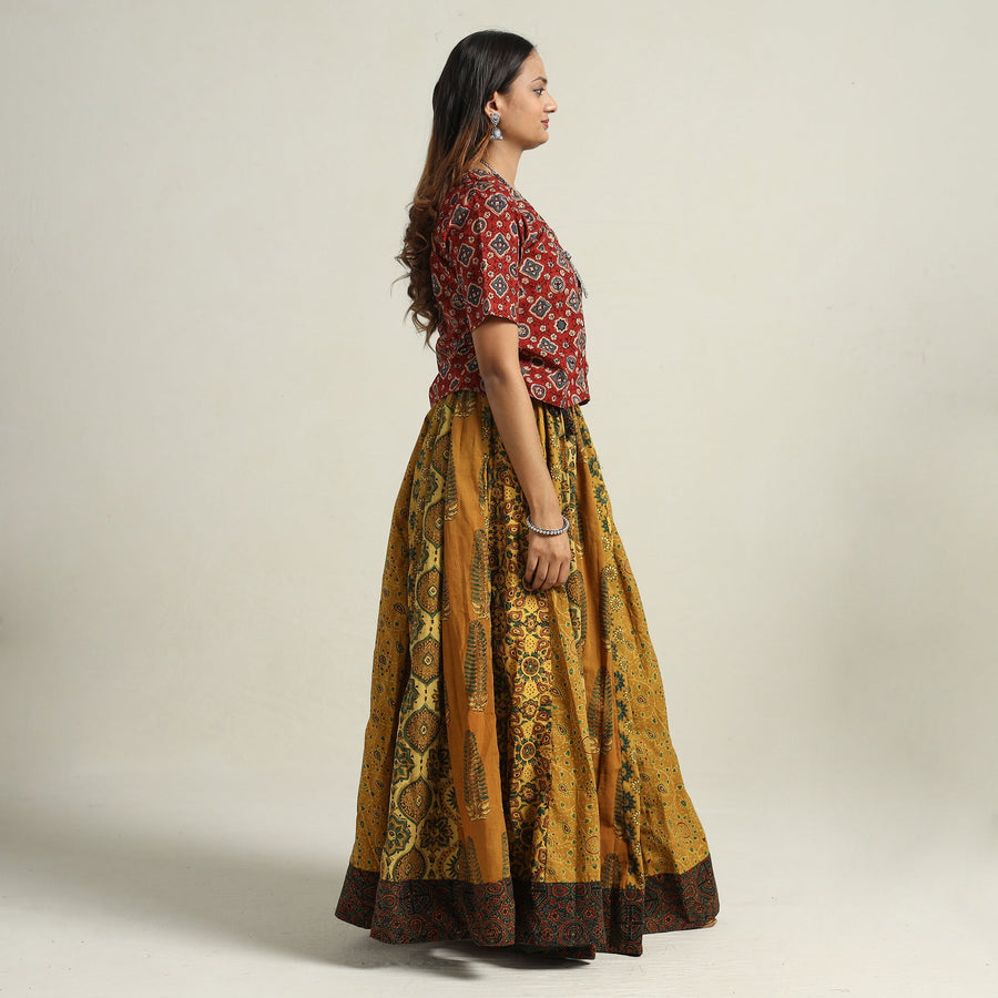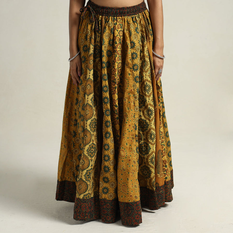 Elevate your wardrobe with our yellow patchwork long skirt, skillfully crafted from ajrakh block-printed, natural-dyed cotton fabric. This skirt boasts a waist tie-up closure, allowing for a customized and comfortable fit. The patchwork kali design adds a unique touch, showcasing the skilled craftsmanship behind its creation. The natural dyes used in the printing process enhance the overall beauty of the garment. The intricate patterns and vibrant colors reflect the cultural heritage of Gujarat. Perfect for both casual and semi-formal occasions.