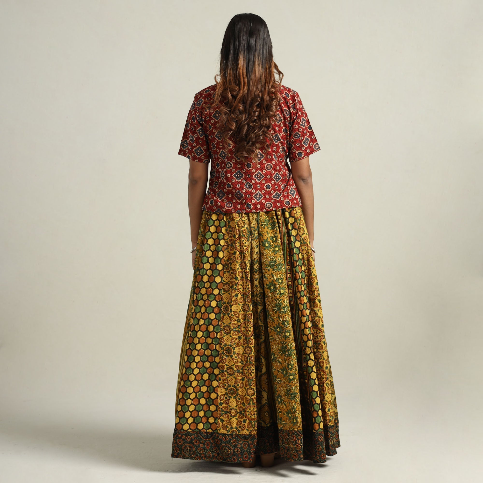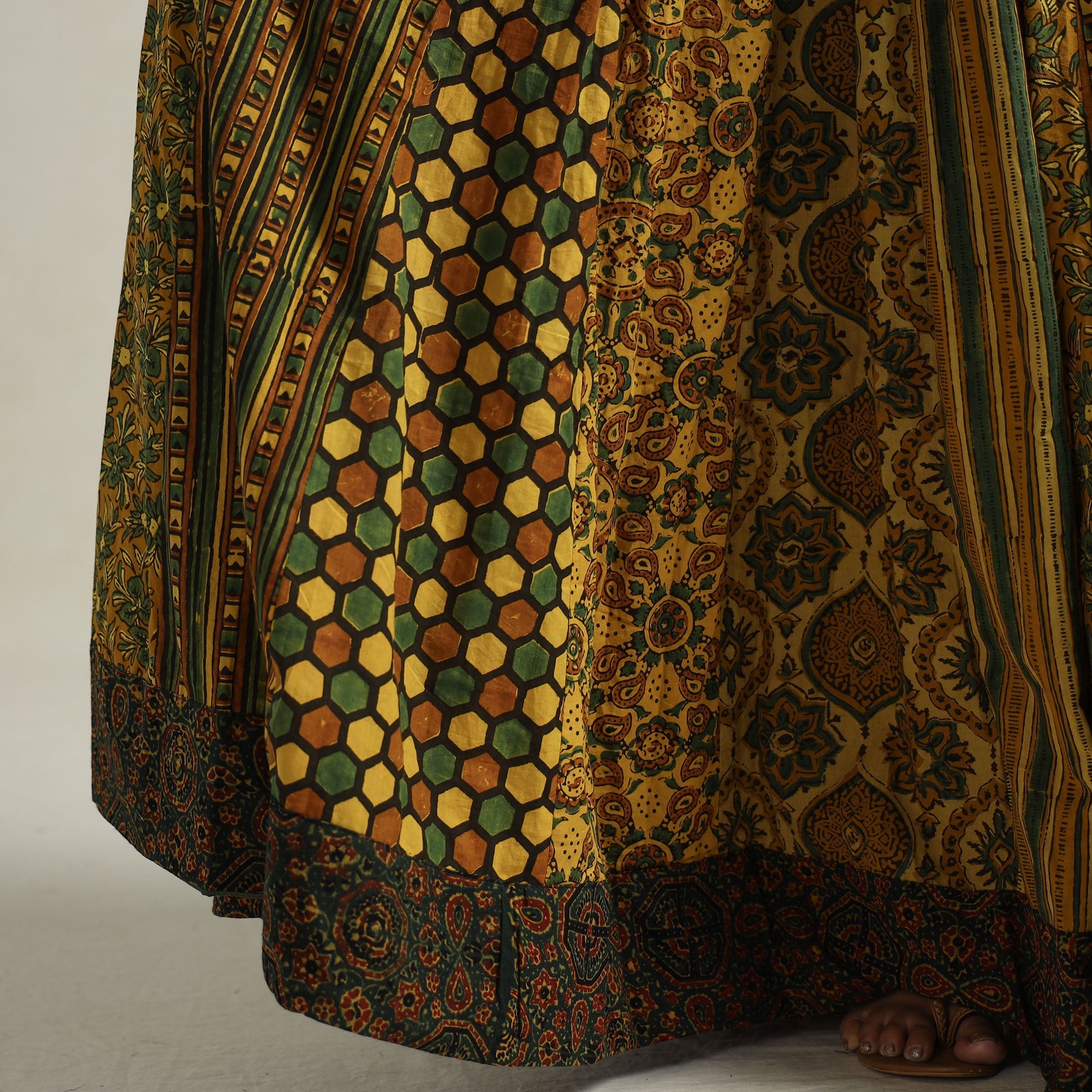 Elevate your wardrobe with our yellow patchwork long skirt, skillfully crafted from ajrakh block-printed, natural-dyed cotton fabric. This skirt boasts a waist tie-up closure, allowing for a customized and comfortable fit. The patchwork kali design adds a unique touch, showcasing the skilled craftsmanship behind its creation. The natural dyes used in the printing process enhance the overall beauty of the garment. The intricate patterns and vibrant colors reflect the cultural heritage of Gujarat. Perfect for both casual and semi-formal occasions.