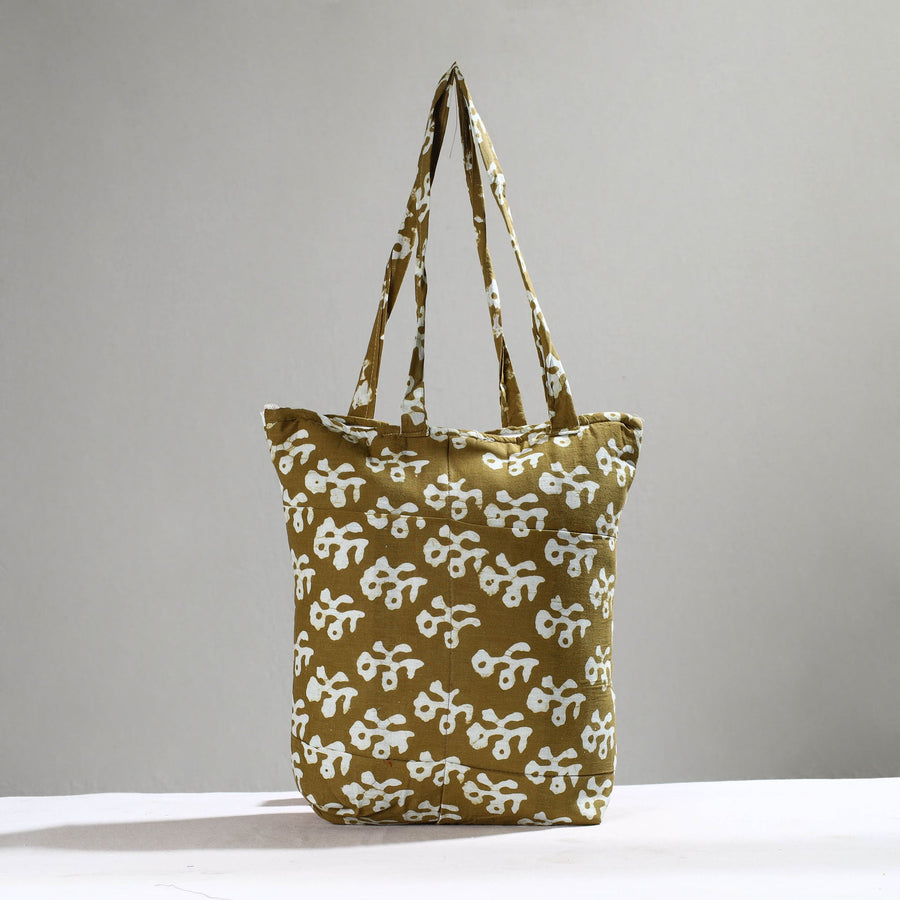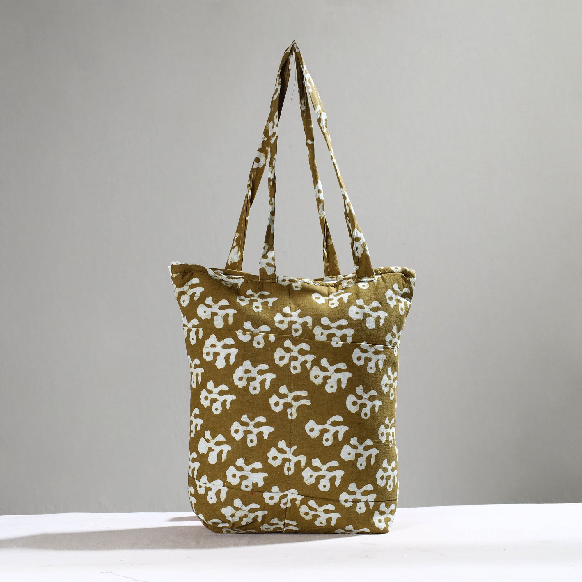 This brown hand bag is crafted from hand-batik-printed cotton fabric, showcasing a blend of style and functionality. Featuring a PVC waterproof sheet layer inside, it ensures your belongings stay safe and dry. It has enough space to accommodate most of the items. With its spacious interior, this bag effortlessly holds all your essentials in place. Embrace the allure of handmade craftsmanship while enjoying the functionality of a trendy accessory that complements your everyday adventures with ease.
