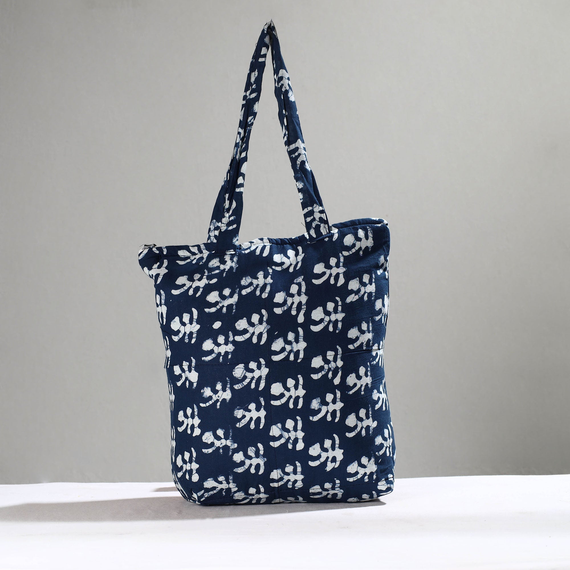 This blue hand bag is crafted from hand-batik-printed cotton fabric, showcasing a blend of style and functionality. Featuring a PVC waterproof sheet layer inside, it ensures your belongings stay safe and dry. It has enough space to accommodate most of the items. With its spacious interior, this bag effortlessly holds all your essentials in place. Embrace the allure of handmade craftsmanship while enjoying the functionality of a trendy accessory that complements your everyday adventures with ease.