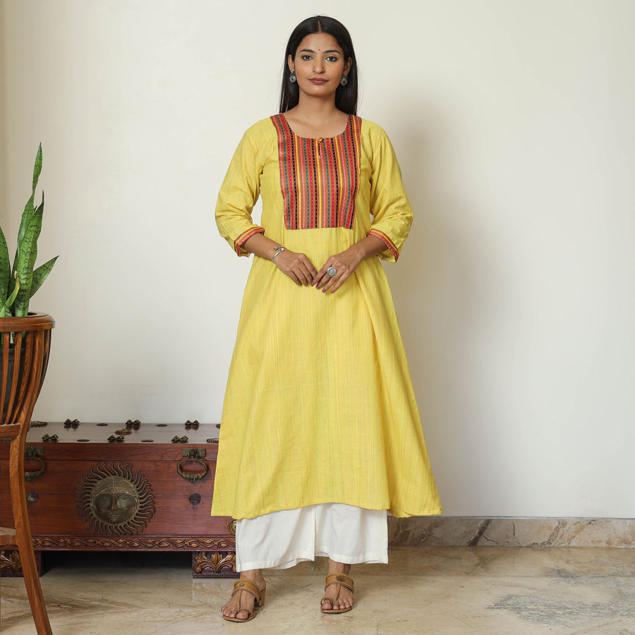 Look and feel beautiful in this uniquely designed yellow mangalagiri handloom cotton a-line kurta with mashru patchwork. This exquisite kurta is crafted from handloom cotton fabric, ensuring a comfortable feel against your skin. The kurta also features a convenient one-side pocket, perfect for carrying small essentials. It boasts an exquisite mashru silk patchwork designs, adding a touch of elegance to your ensemble. This cotton kurta makes you comfortable all day long. It's an ideal choice for both casual and festive occasions.
