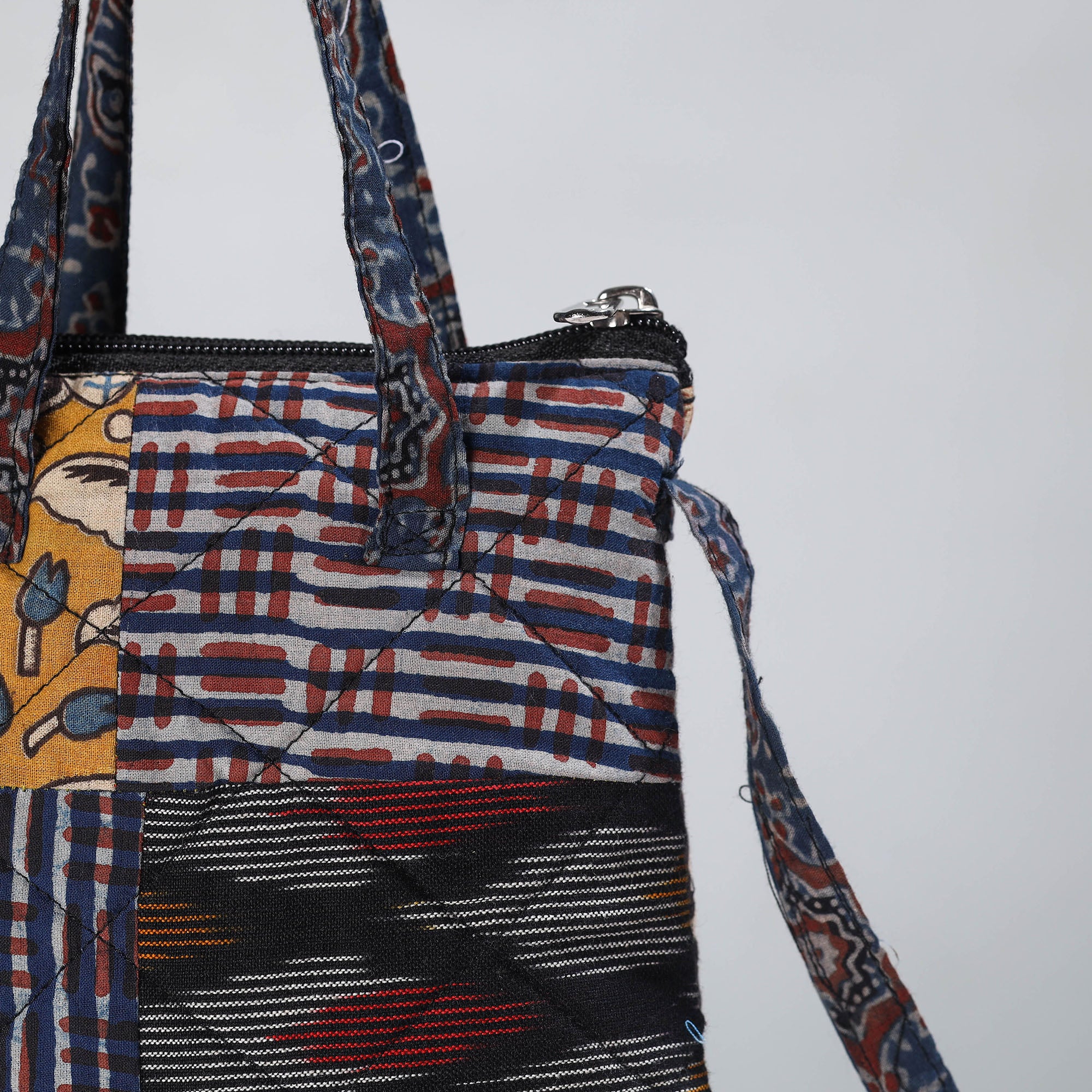 Multicolor handmade quilted cotton patchwork sling bag by Noori Bazar. This sling bag is made from a blend of cotton fabrics. This sling bag boasts four convenient pockets, providing ample space for your essentials. The foam layer lining ensures durability and protection. Enhance your style with this unique, functional accessory.