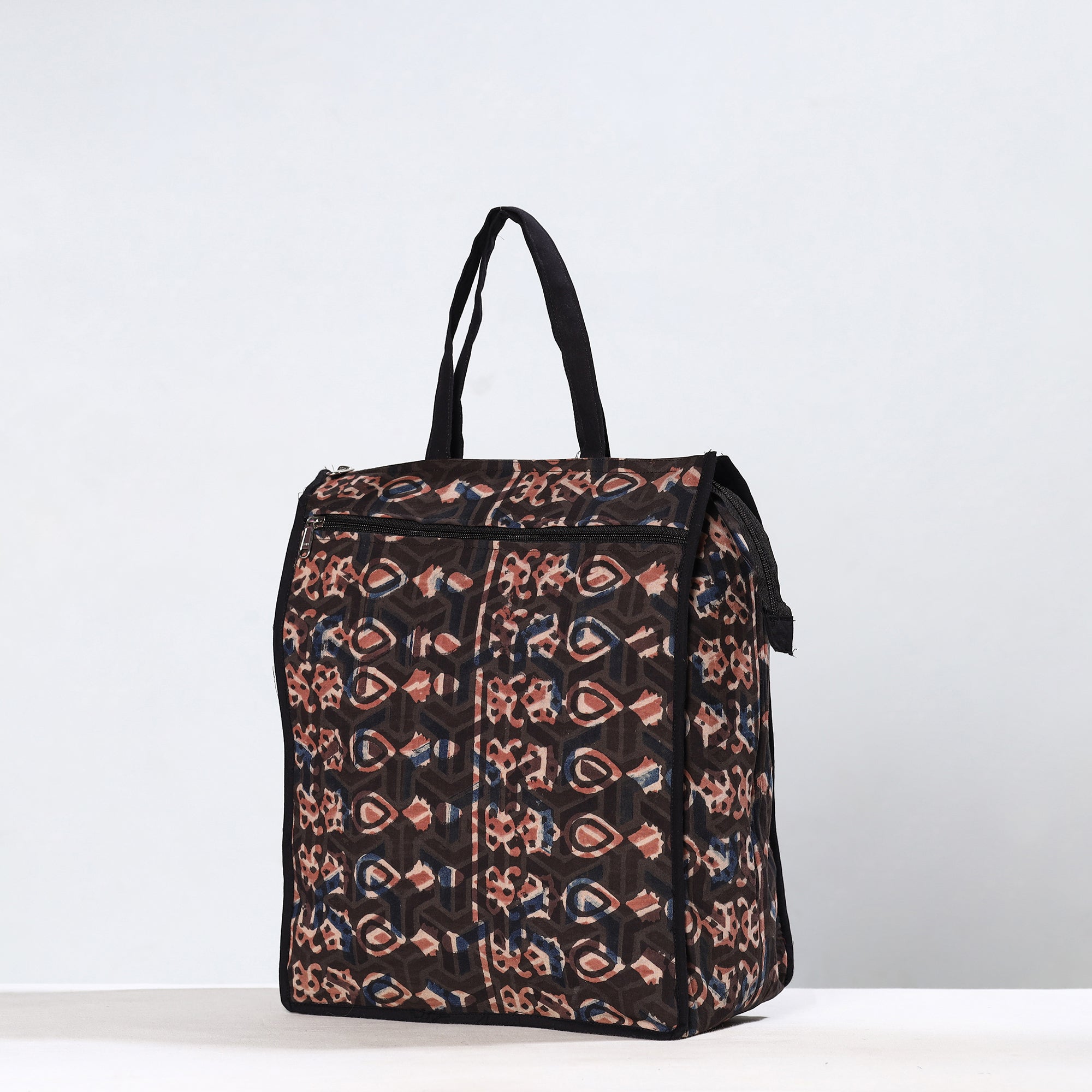 Material Enhance your shopping routine with our black handmade bagru block-printed cotton shopping bag. Crafted from premium cotton, it seamlessly blends durability and style. The spacious design accommodates daily essentials, making it a versatile accessory. Textured with handmade textiles from India, this bag serves practical purposes and also showcases artisanal craftsmanship.