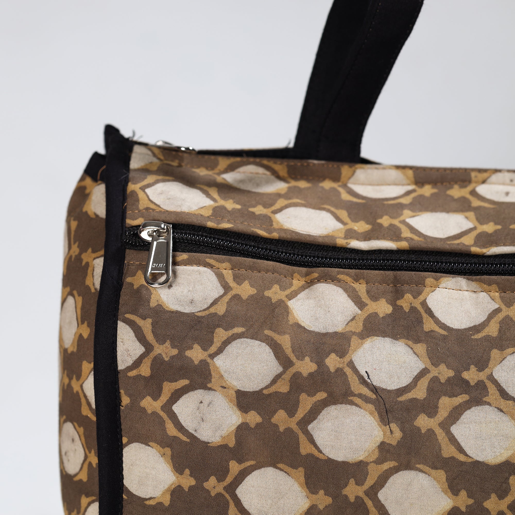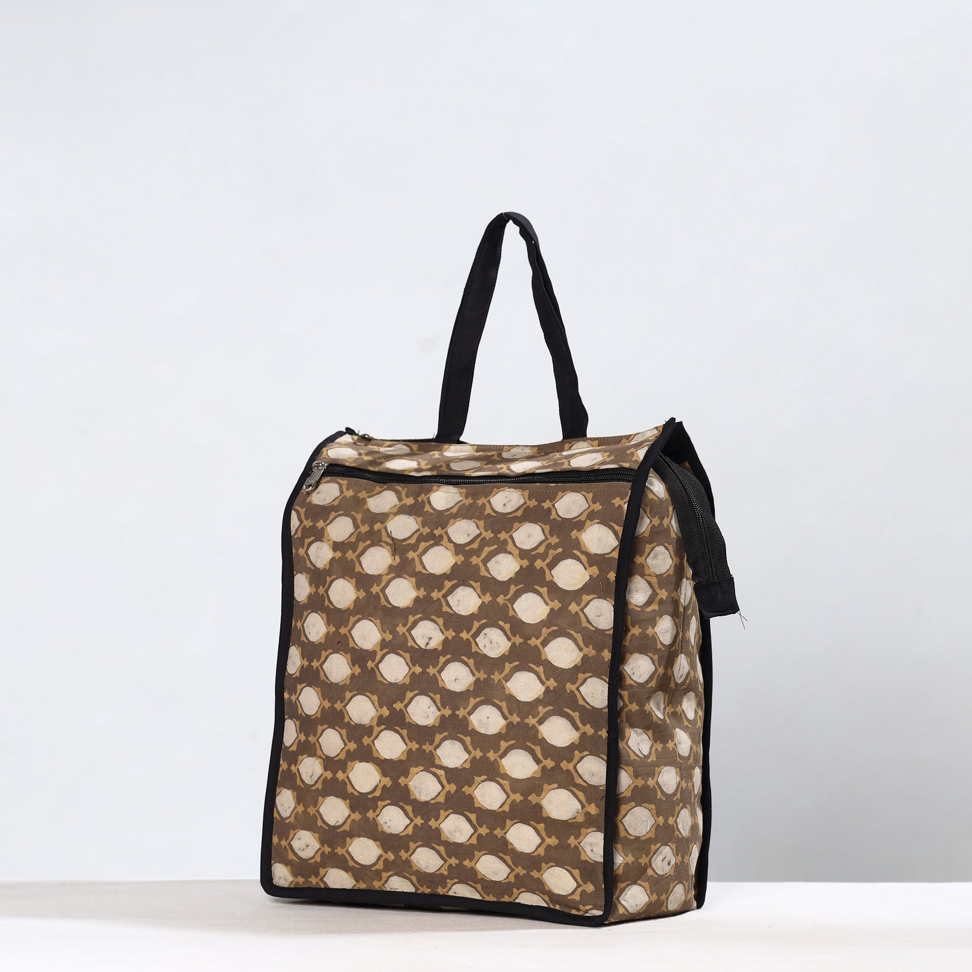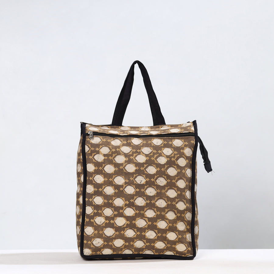 Enhance your shopping routine with our brown handmade akola block-printed cotton shopping bag. Crafted from premium cotton, it seamlessly blends durability and style. The spacious design accommodates daily essentials, making it a versatile accessory. Textured with handmade textiles from India, this bag serves practical purposes and also showcases artisanal craftsmanship.
