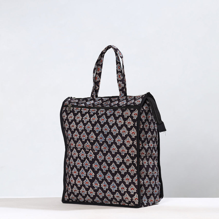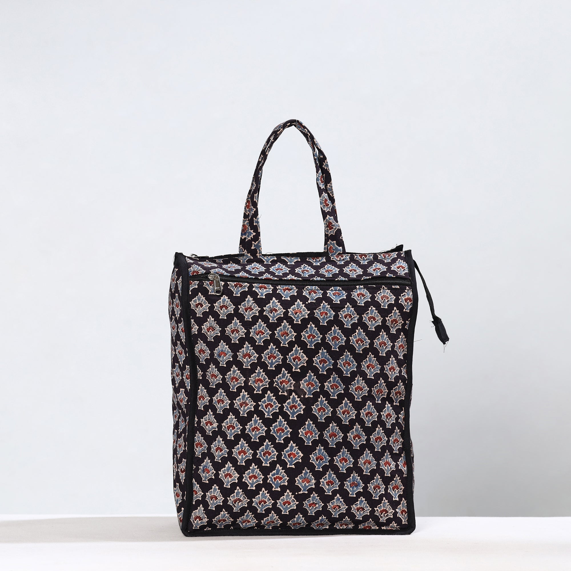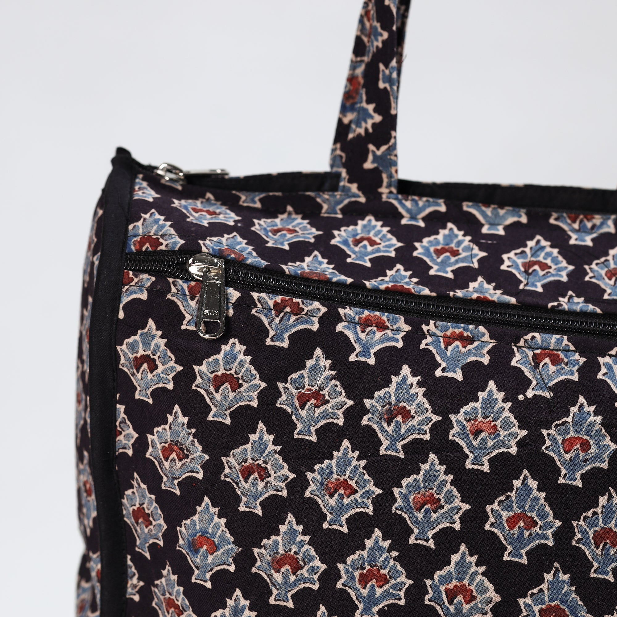 Enhance your shopping routine with our black handmade ajrakh block-printed cotton shopping bag. Crafted from premium cotton, it seamlessly blends durability and style. The spacious design accommodates daily essentials, making it a versatile accessory. Textured with handmade textiles from India, this bag serves practical purposes and also showcases artisanal craftsmanship.