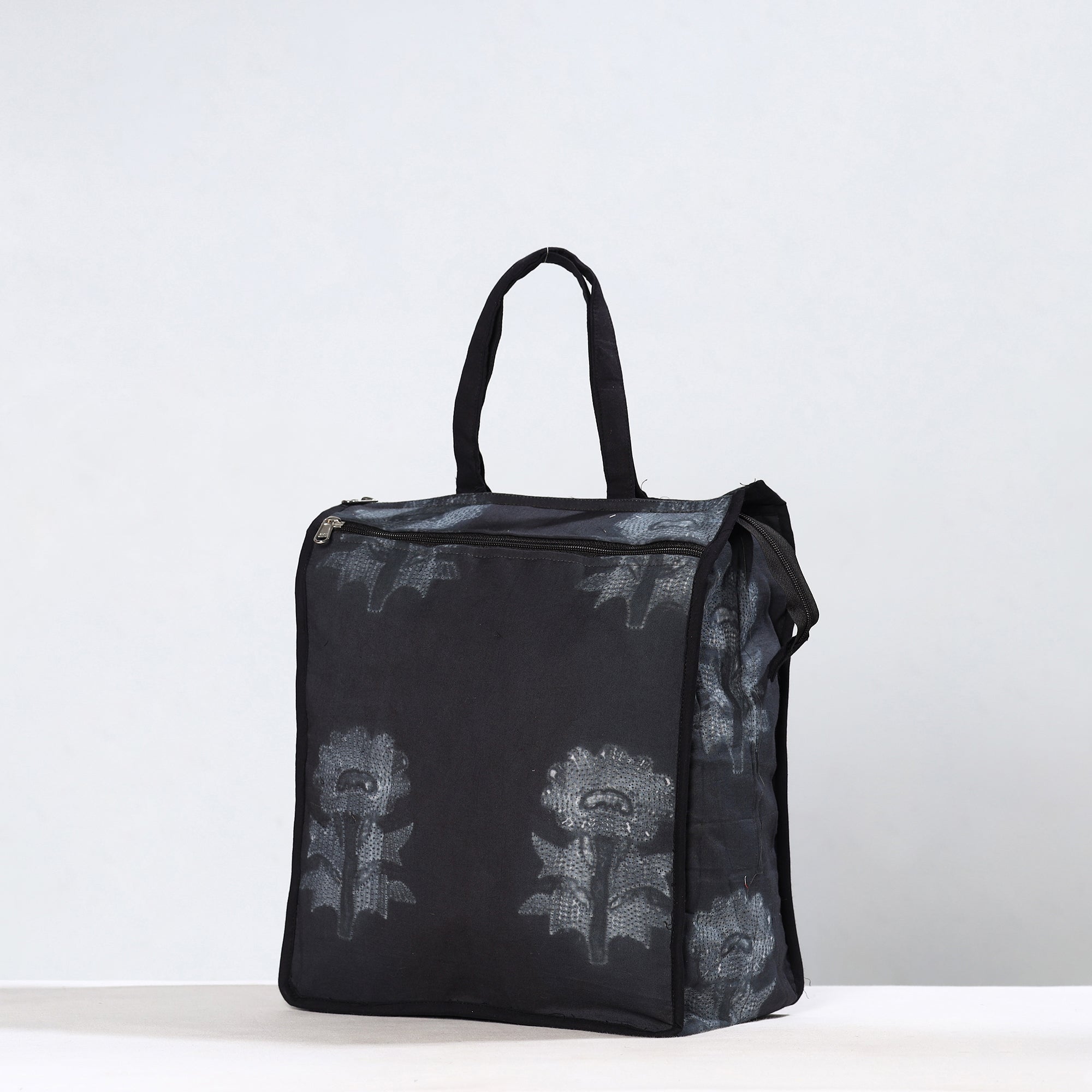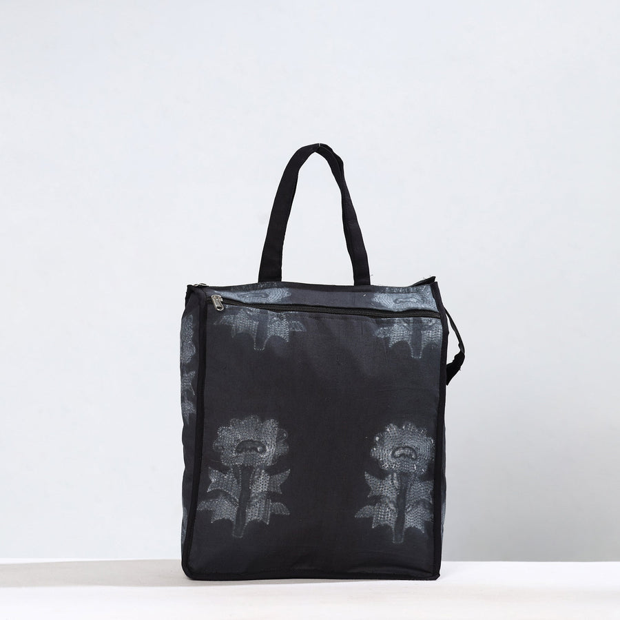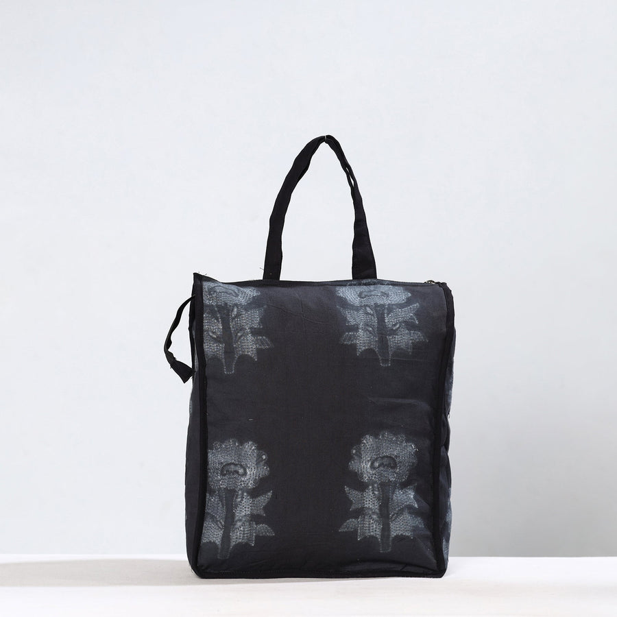 Enhance your shopping routine with our black handmade nui shibori tie-dye cotton shopping bag. Crafted from premium cotton, it seamlessly blends durability and style. The spacious design accommodates daily essentials, making it a versatile accessory. Textured with handmade textiles from India, this bag serves practical purposes and also showcases artisanal craftsmanship.