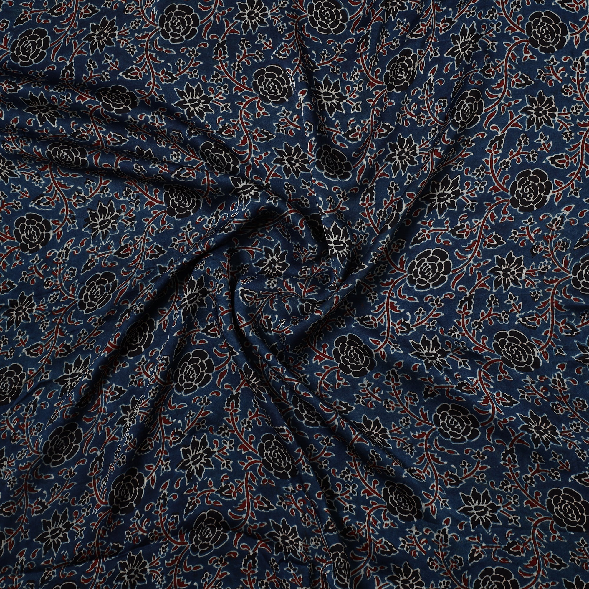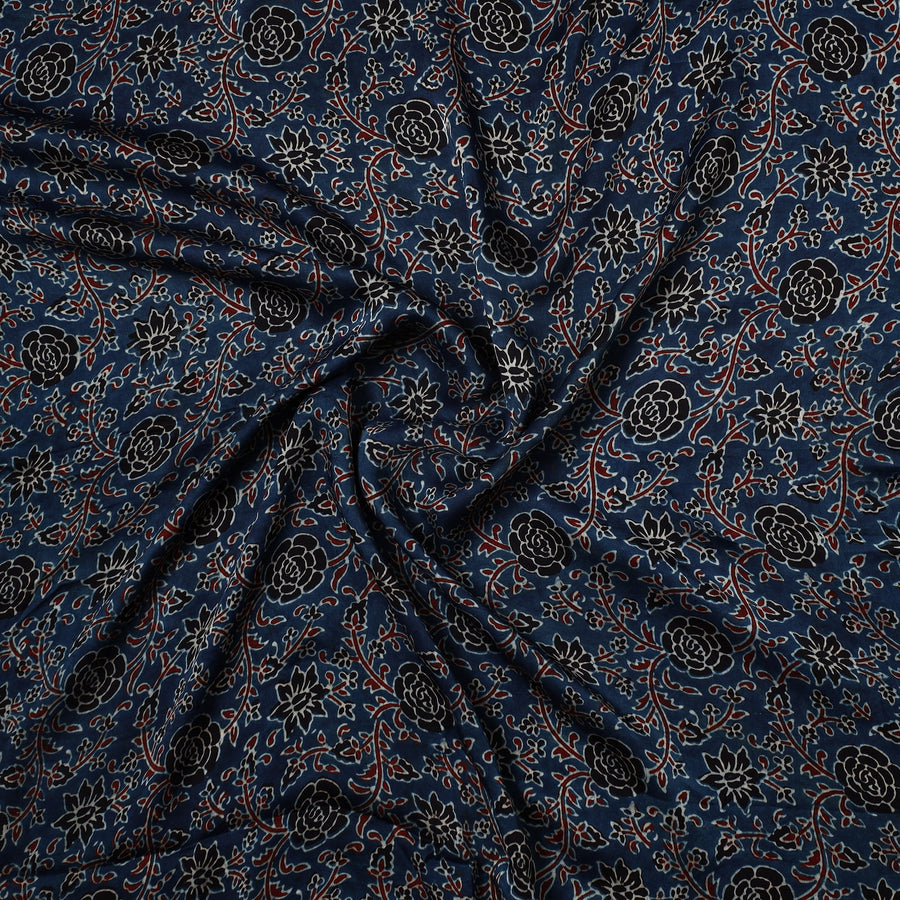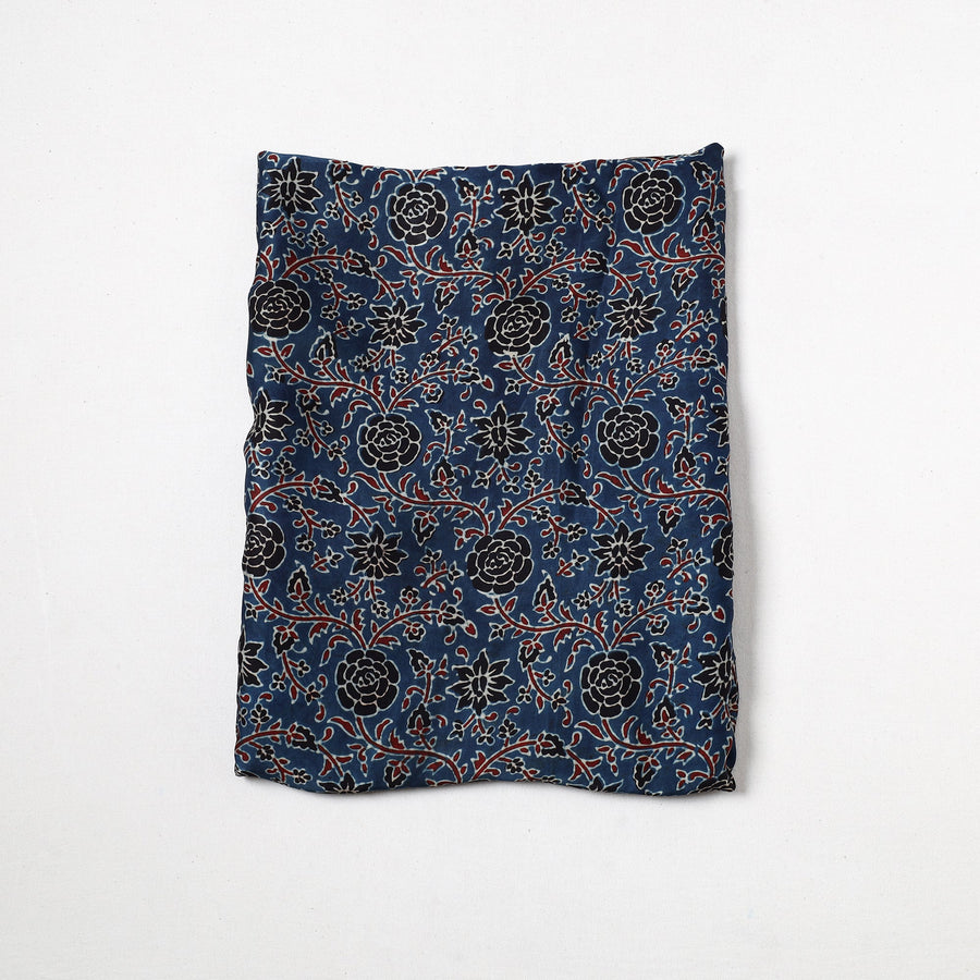 This finest-quality blue ajrakh hand block printed modal silk precut fabric is made using natural dyes through traditional ajrakh technique of hand-block printing practised by the master artisan, Riyaz Abdulmajid Khatri, in the Kutch region of Gujarat. This precut fabric is crafted from fine modal silk, known for its luxurious texture. Perfect for crafting elegant blouses, bags, decorative items, etc. This exquisite textile symbolizes timeless sophistication, adding a touch of elegance to any wardrobe.