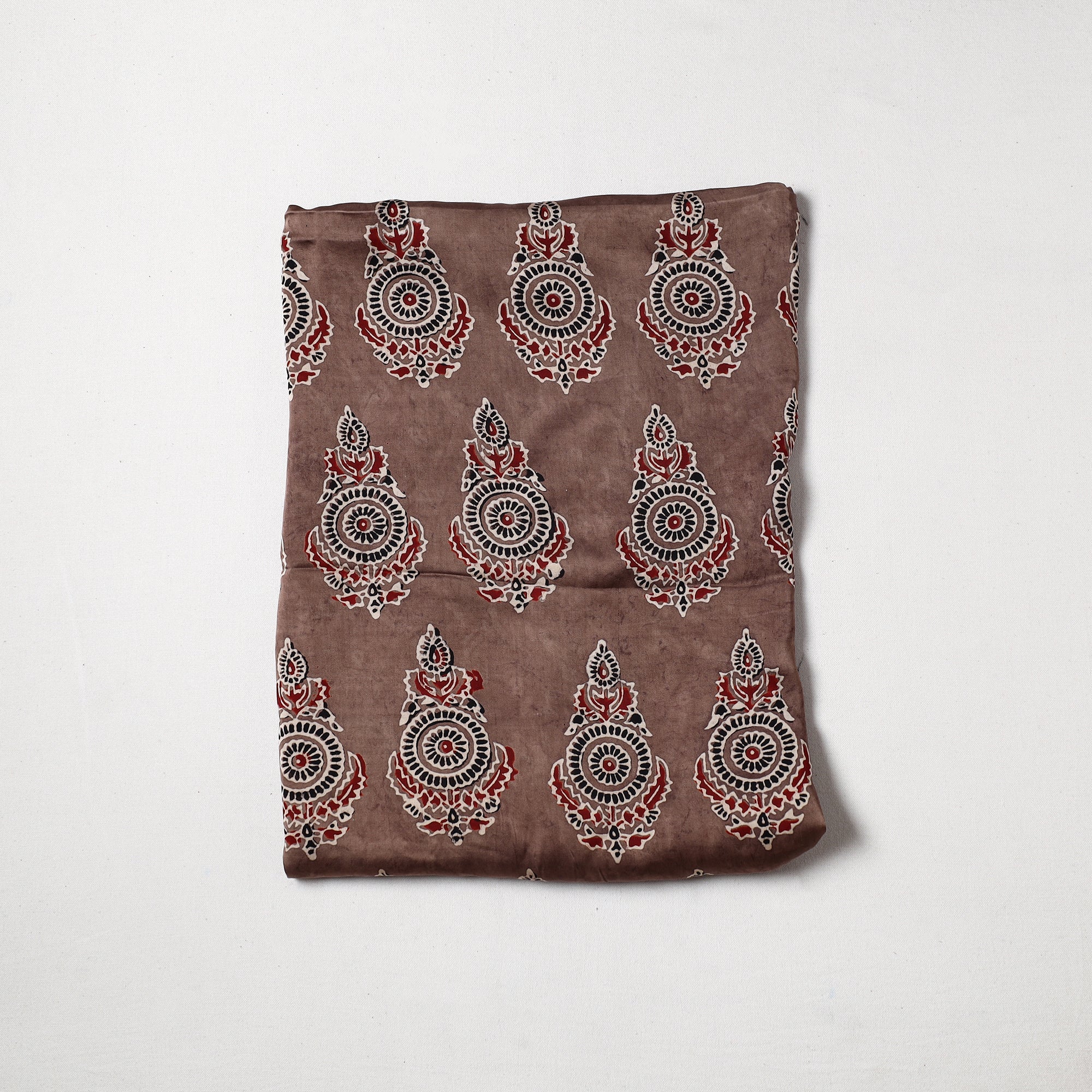 This finest-quality brown ajrakh hand block printed modal silk precut fabric is made using natural dyes through traditional ajrakh technique of hand-block printing practised by the master artisan, Riyaz Abdulmajid Khatri, in the Kutch region of Gujarat. This precut fabric is crafted from fine modal silk, known for its luxurious texture. Perfect for crafting elegant blouses, bags, decorative items, etc. This exquisite textile symbolizes timeless sophistication, adding a touch of elegance to any wardrobe.