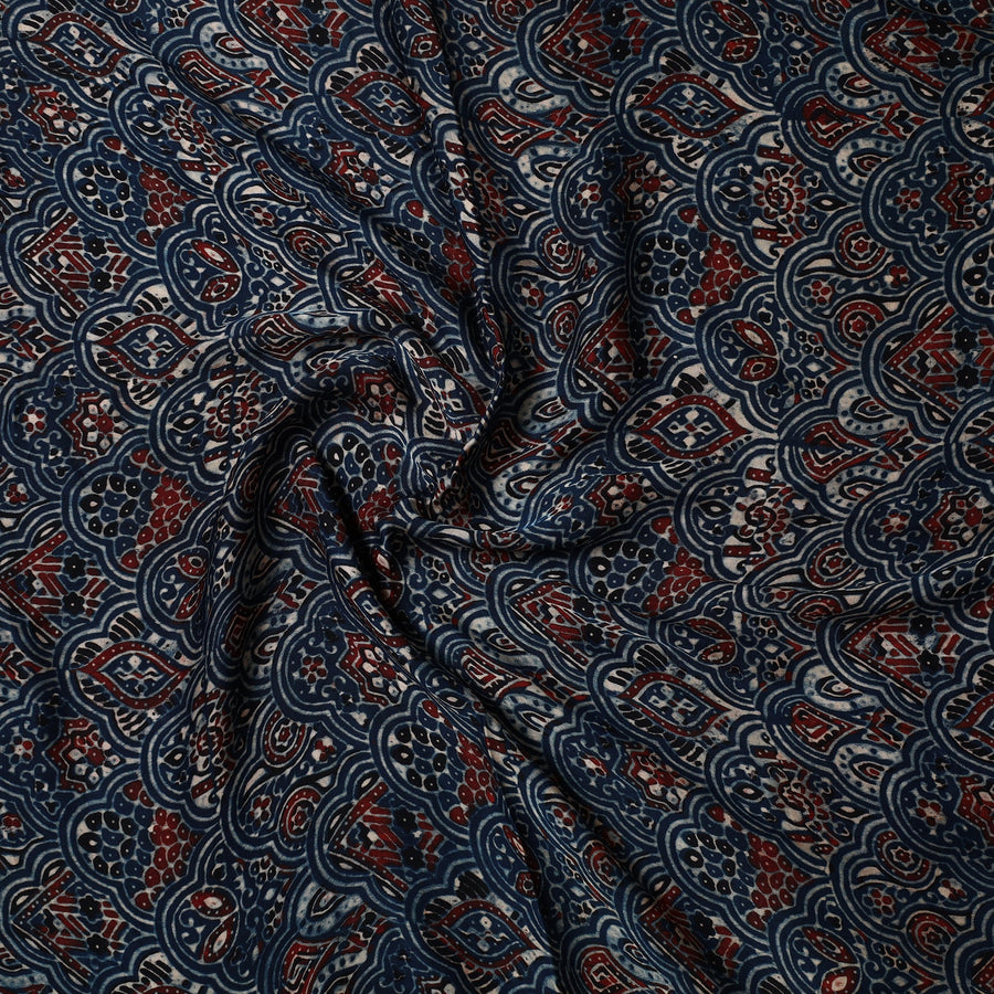 This finest-quality blue ajrakh hand block printed modal silk precut fabric is made using natural dyes through traditional ajrakh technique of hand-block printing practised by the master artisan, Riyaz Abdulmajid Khatri, in the Kutch region of Gujarat. This precut fabric is crafted from fine modal silk, known for its luxurious texture. Perfect for crafting elegant blouses, bags, decorative items, etc. This exquisite textile symbolizes timeless sophistication, adding a touch of elegance to any wardrobe.