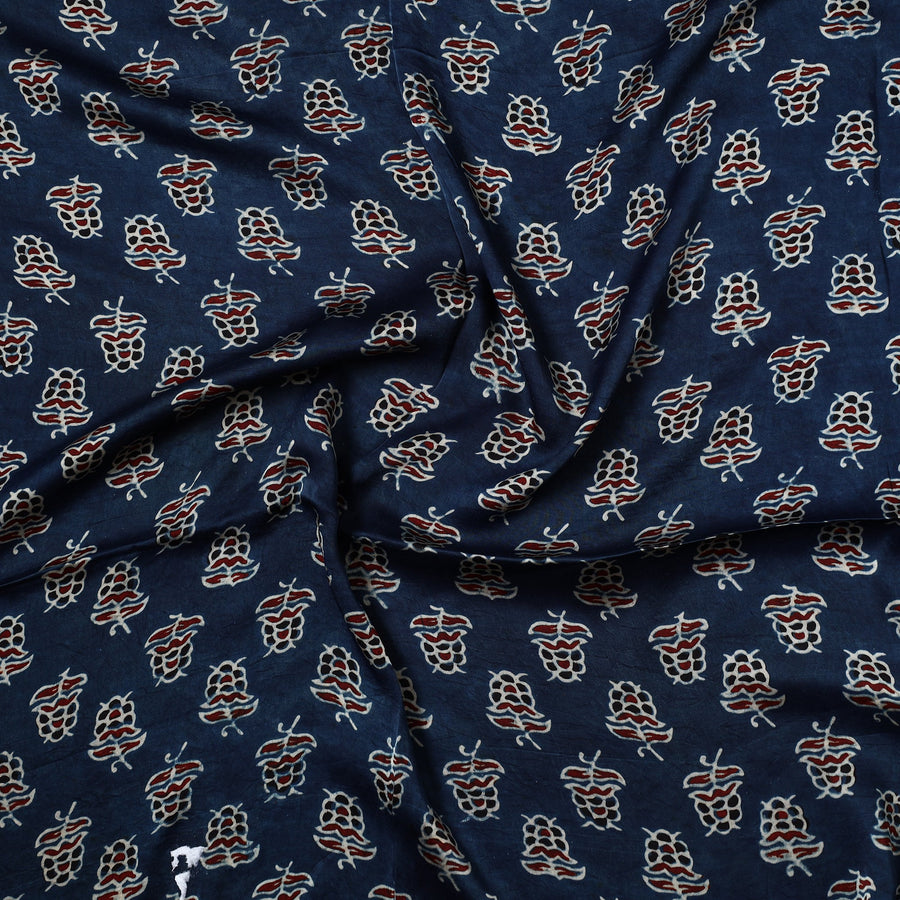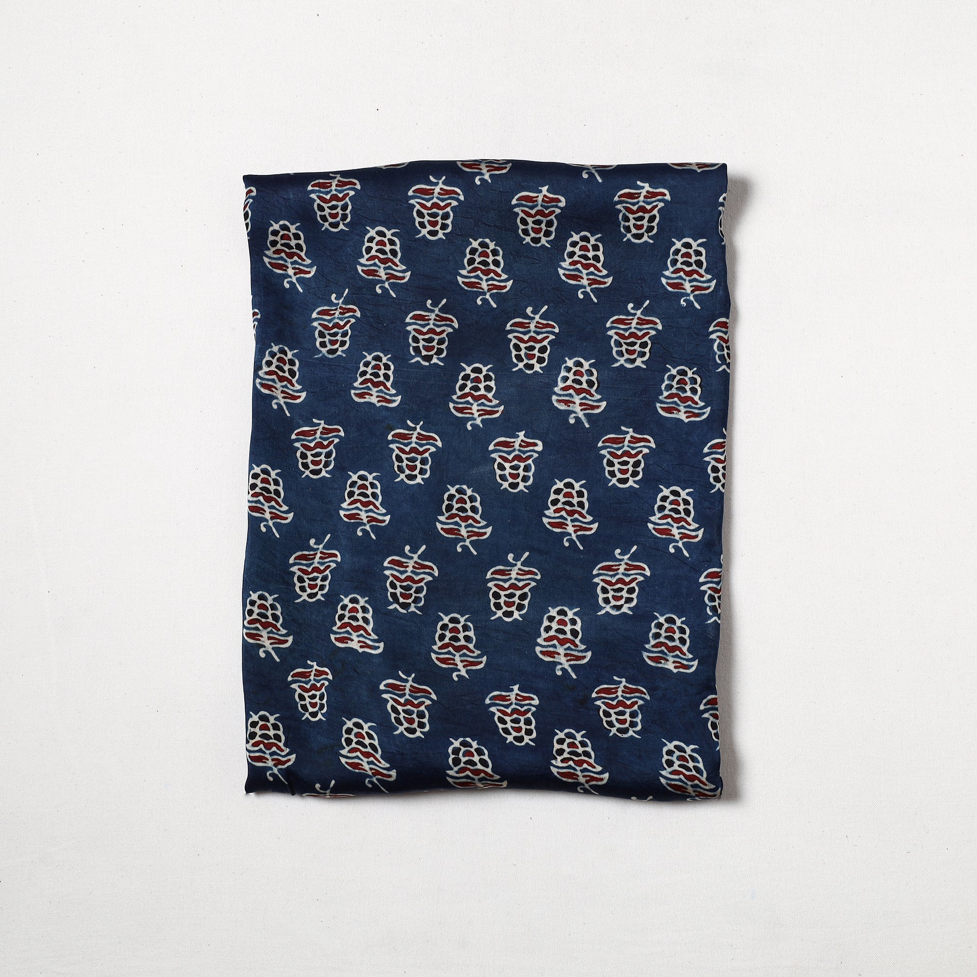 This finest-quality blue ajrakh hand block printed modal silk precut fabric is made using natural dyes through traditional ajrakh technique of hand-block printing practised by the master artisan, Riyaz Abdulmajid Khatri, in the Kutch region of Gujarat. This precut fabric is crafted from fine modal silk, known for its luxurious texture. Perfect for crafting elegant blouses, decorative items, etc. This exquisite textile symbolizes timeless sophistication, adding a touch of elegance to any wardrobe.