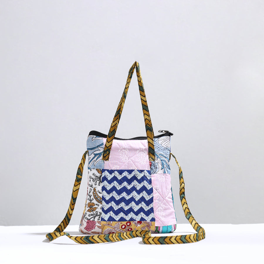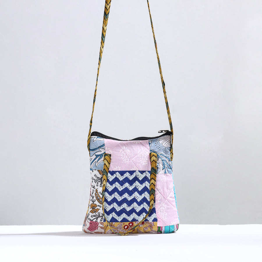 Multicolor handmade quilted cotton patchwork sling bag by Noori Bazar. This sling bag is made from a blend of cotton fabrics. This sling bag boasts four convenient pockets, providing ample space for your essentials. The foam layer lining ensures durability and protection. Enhance your style with this unique, functional accessory.