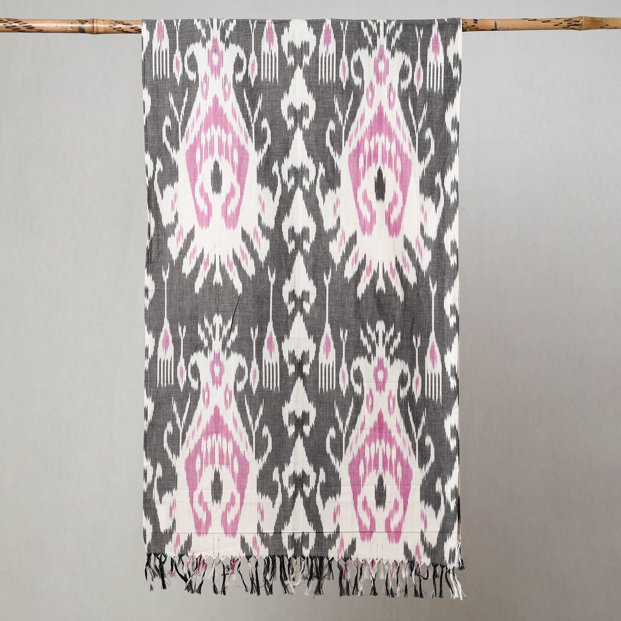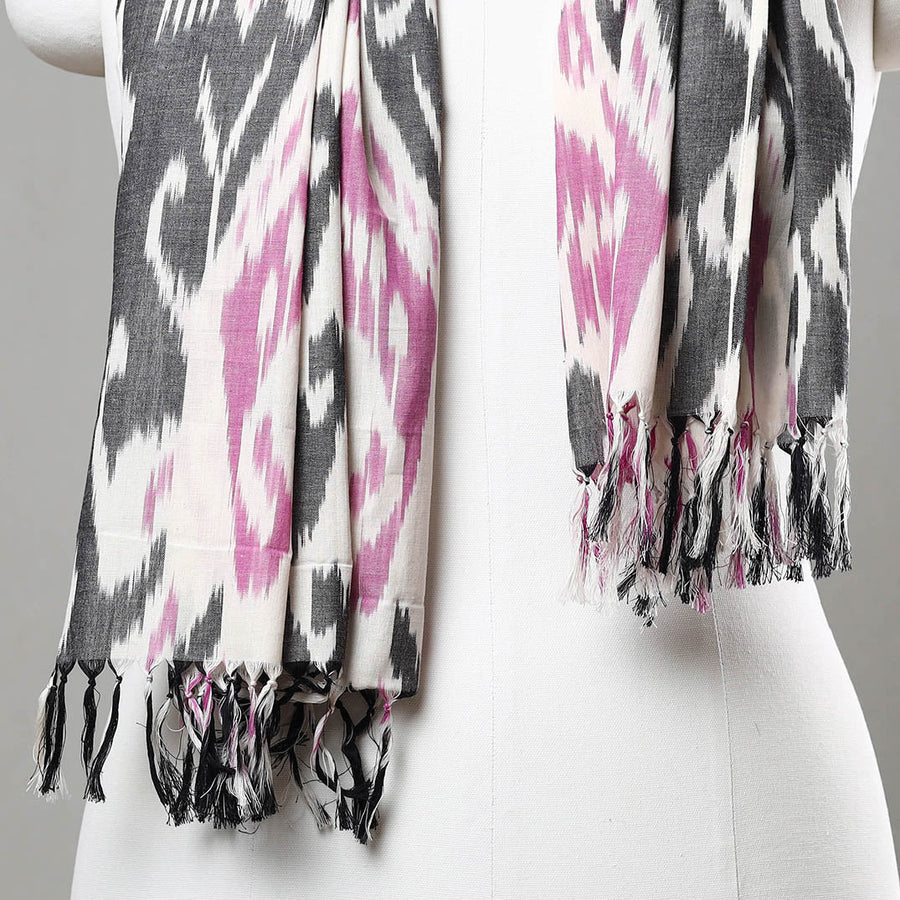 Enhance your look with the pochampally central asian ikat handloom cotton stole with tassels from Telangana. This exquisite stole, crafted using traditional ikat weaving techniques, adds a touch of elegance to any outfit. Perfect for any occasion, its soft cotton fabric ensures comfort, while the intricate patterns and tassels provide a stylish flair, making it an ideal accessory for both casual and formal wear.