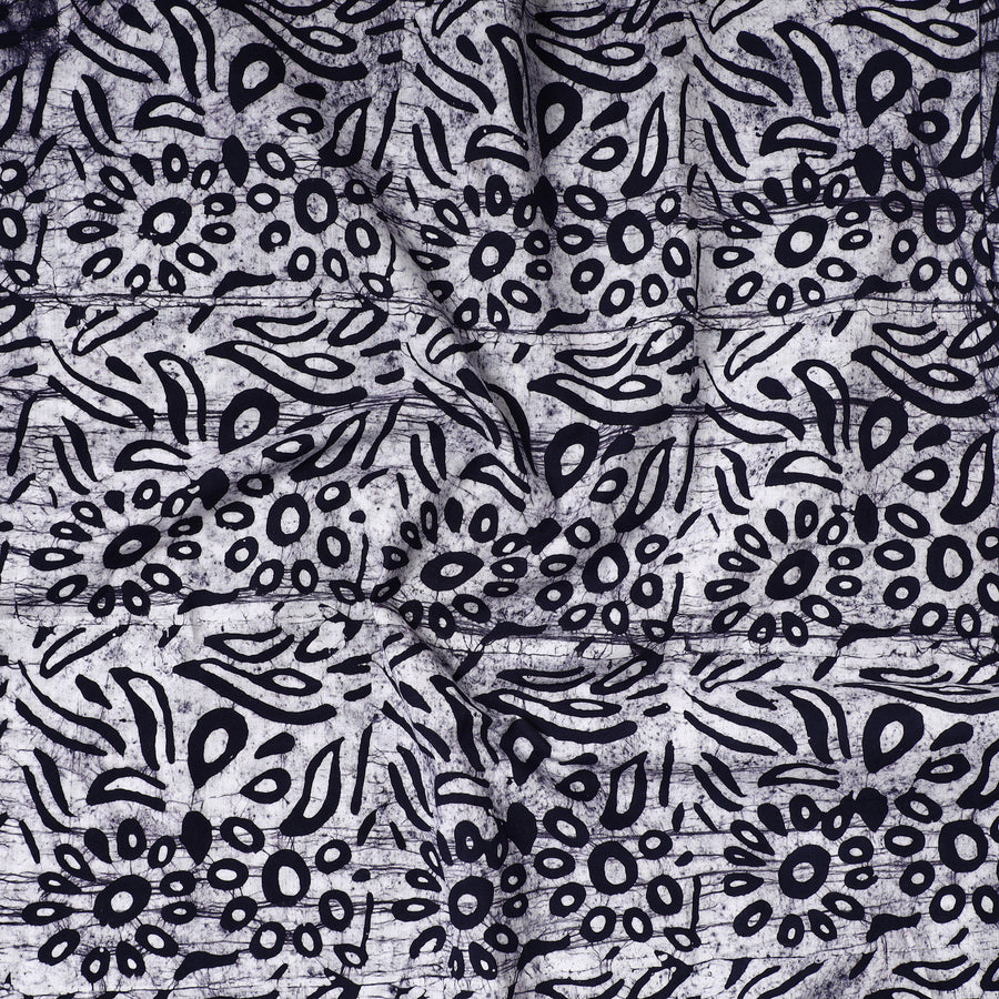 Fine quality black hand batik printed pure cotton precut fabric made by Shakil Ahmed Khatri from Mundra, Kutch. Batik printing is traditionally done using a manual wax-resist dyeing technique. The traditional designs and motifs in Indian batik are often passed down from one generation to another. Perfect for crafting elegant blouses, bags, decorative items, etc., this exquisite textile symbolizes timeless sophistication, adding a touch of elegance to any wardrobe.