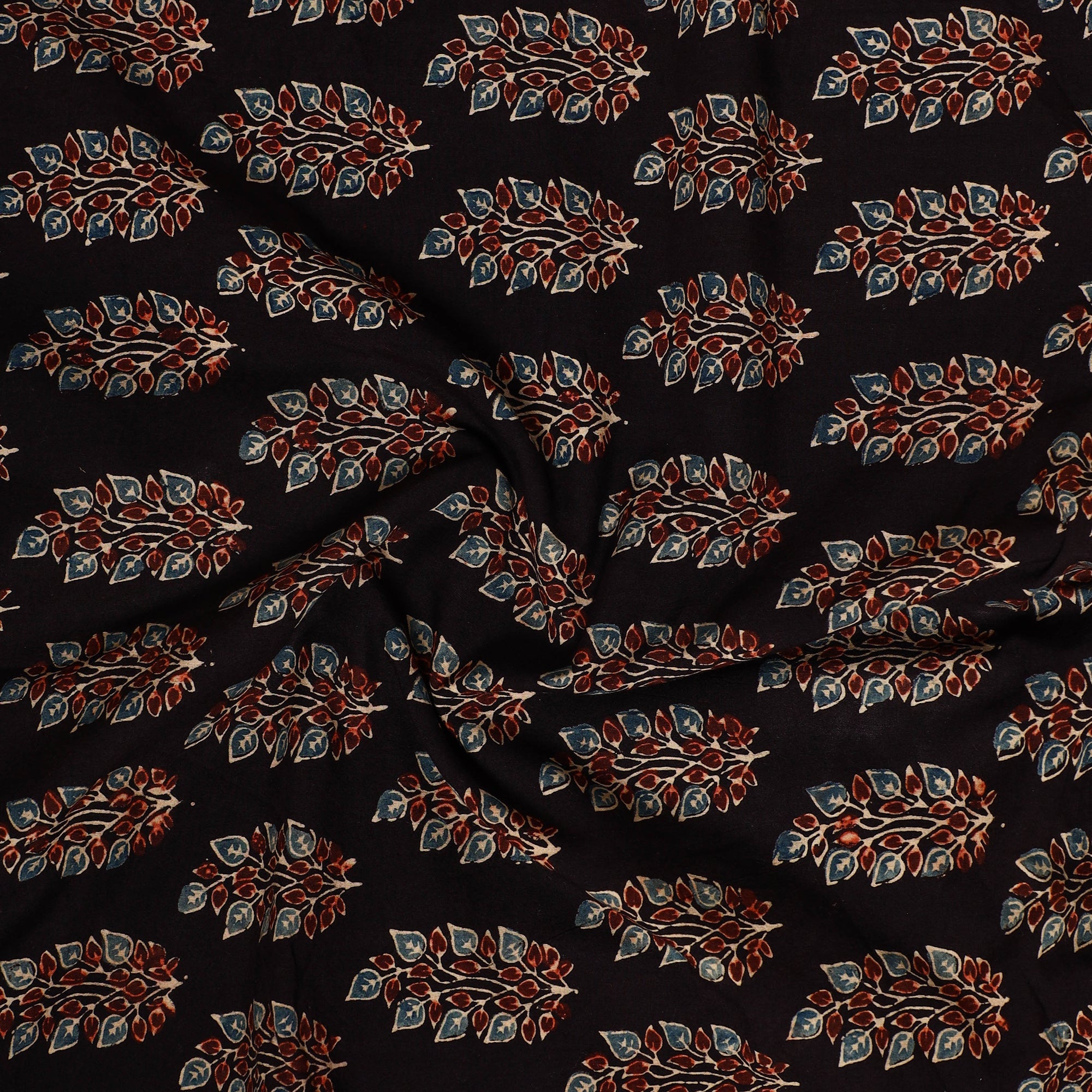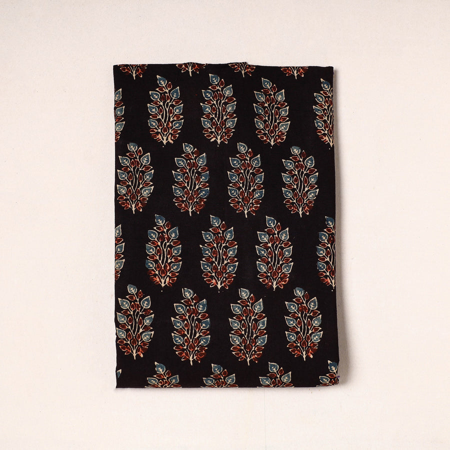 Fine quality black ajrakh block printed cotton precut fabric, made using natural dyes through traditional ajrakh technique of hand block printing by Abdul Rauph Khatri practised in Kutch region of Gujarat. Perfect for crafting elegant blouses, bags, decorative items, etc., this exquisite textile symbolizes timeless sophistication, adding a touch of elegance to any wardrobe.