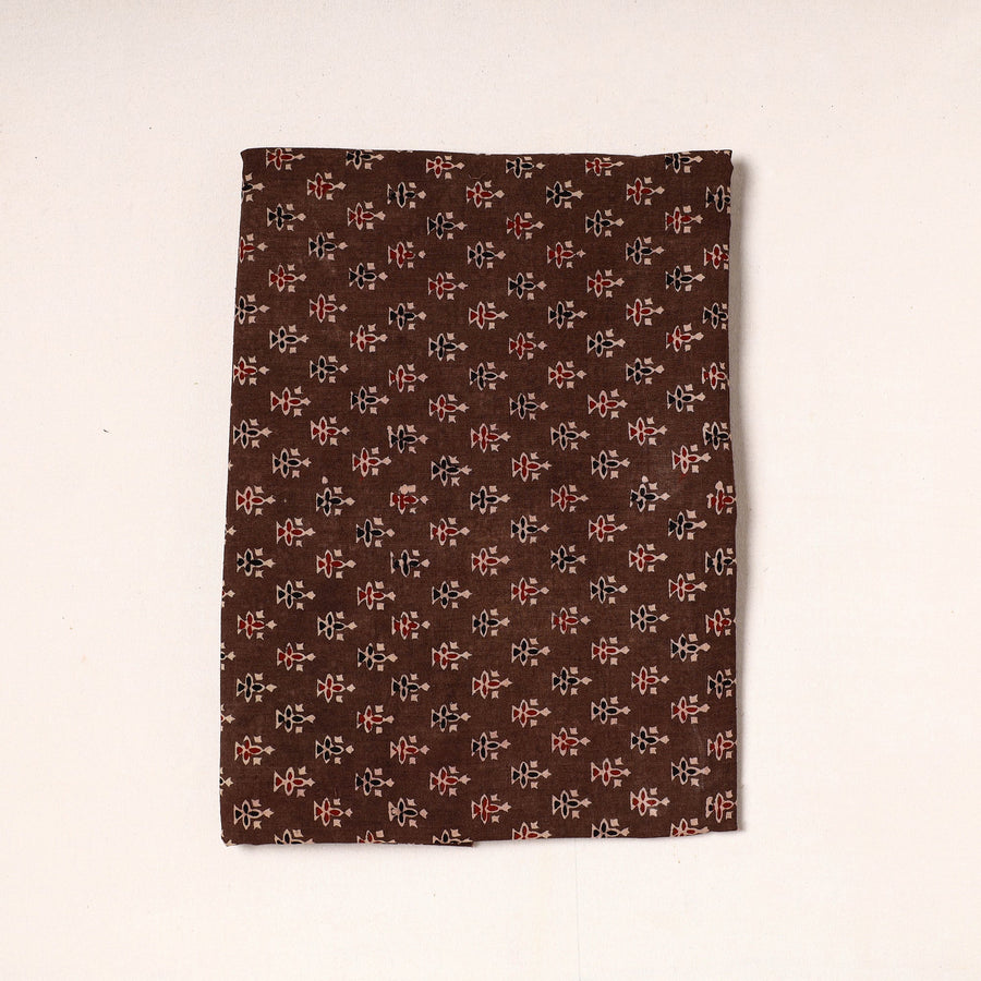 Fine quality brown ajrakh block printed cotton precut fabric, made using natural dyes through traditional ajrakh technique of hand block printing by Abdul Rauph Khatri practised in Kutch region of Gujarat. Perfect for crafting elegant blouses, bags, decorative items, etc., this exquisite textile symbolizes timeless sophistication, adding a touch of elegance to any wardrobe.