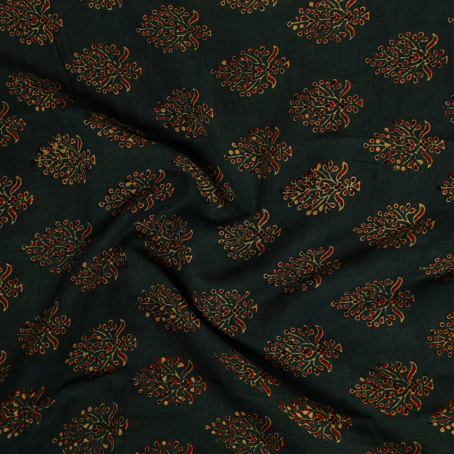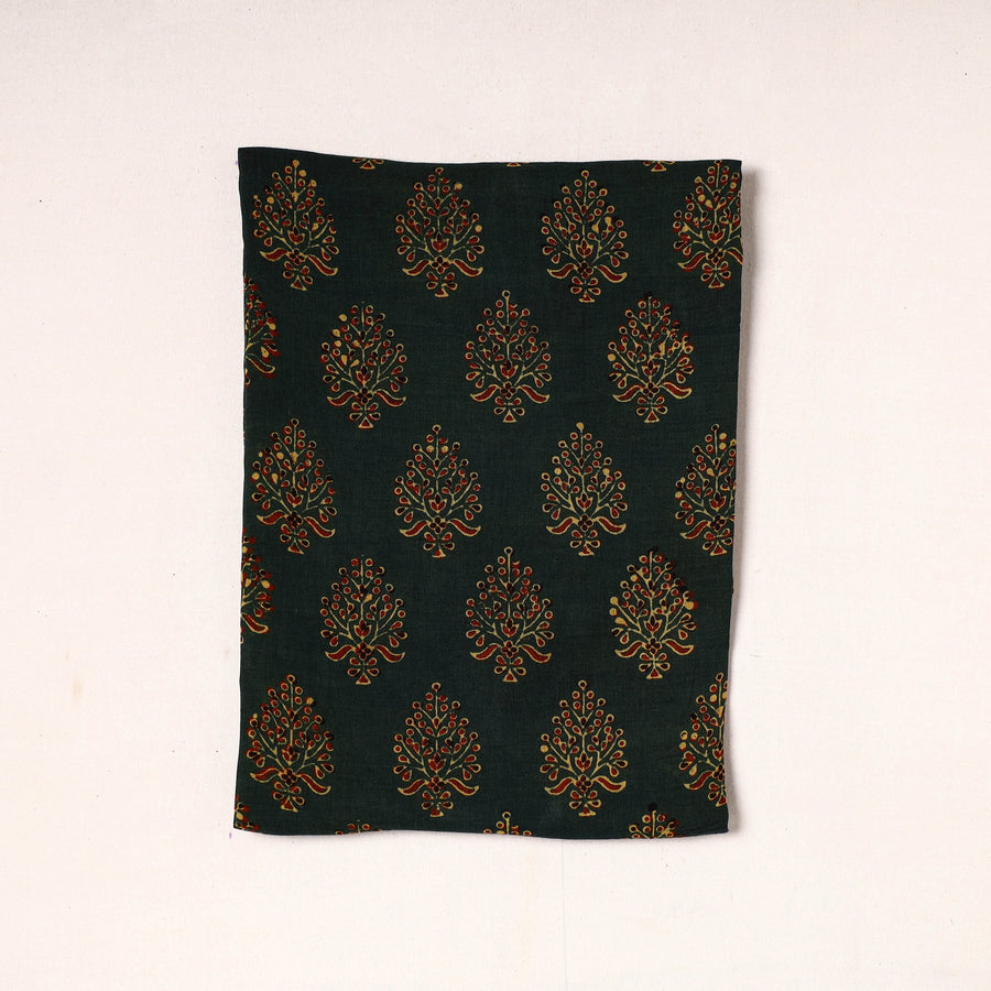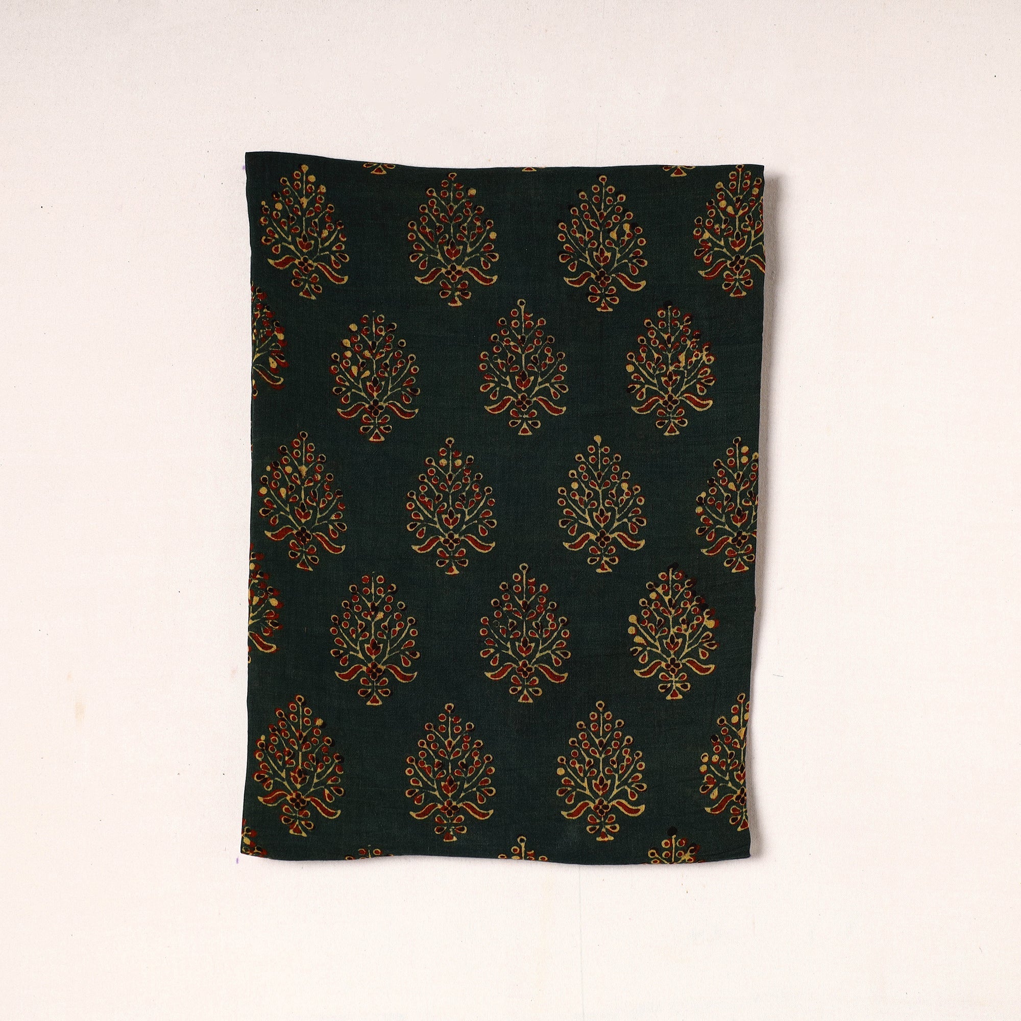 Fine quality green ajrakh block printed cotton precut fabric, made using natural dyes through traditional ajrakh technique of hand block printing by Abdul Rauph Khatri practised in Kutch region of Gujarat. Perfect for crafting elegant blouses, bags, decorative items, etc., this exquisite textile symbolizes timeless sophistication, adding a touch of elegance to any wardrobe.