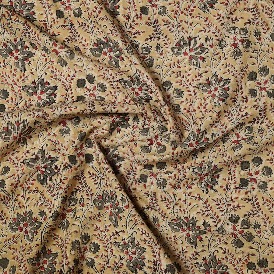 This fine-quality beige kalamkari block-printed cotton precut fabric is made using natural dyes through the traditional process of hand block printing practiced by the artisans of Andhra Pradesh. Perfect for crafting elegant blouses, bags, decorative items, etc., this exquisite textile symbolizes timeless sophistication, adding a touch of elegance to any wardrobe.