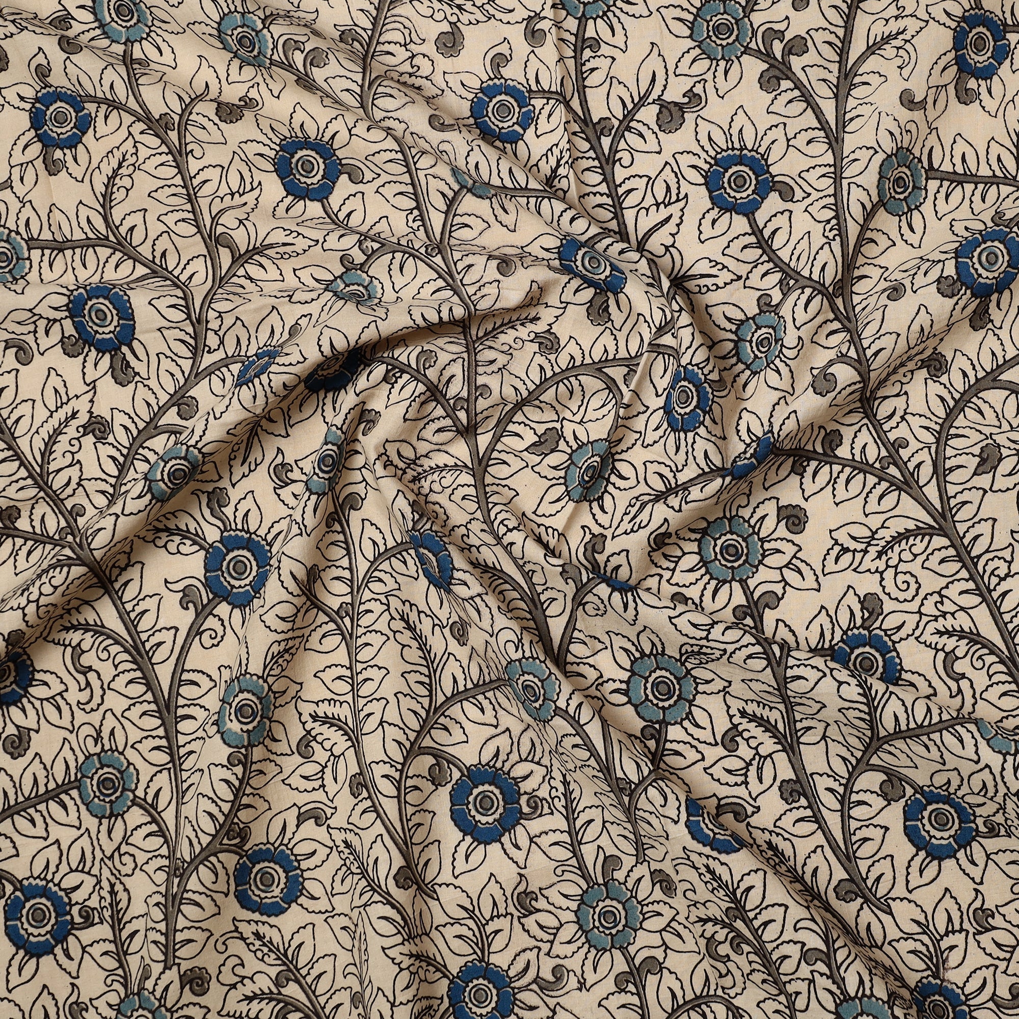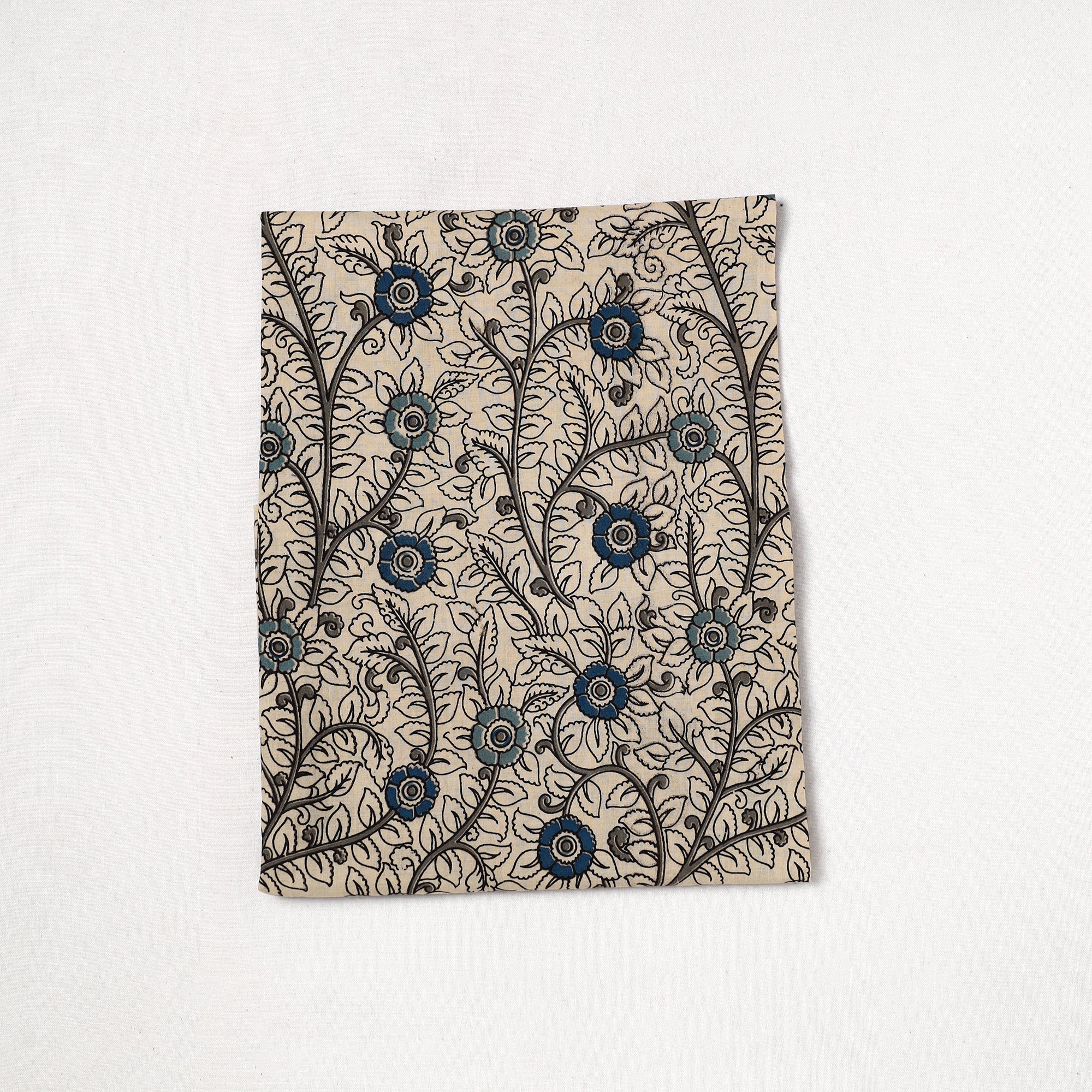 This fine-quality, beige kalamkari-printed cotton precut fabric. Kalamkari is the earliest and more complex technique of printing; this fabric showcases intricate screen-painted motifs on high-quality cotton. Perfect for crafting elegant blouses, bags, decorative items, etc., this exquisite textile symbolizes timeless sophistication, adding a touch of elegance to any wardrobe.