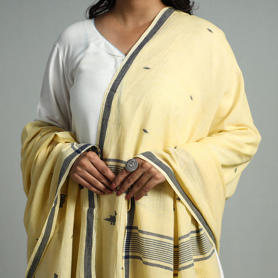 This exquisite Burdwan jamdani buti handloom pure cotton dupatta with tassels is crafted by the artisans of Bengal. Jamdani (extra weft) weaving is a style unique to Bengal, literally like hand embroidery on the loom. The method of weaving resembles tapestry work, in which small shuttles of colored gold or silver threads are passed through the warp. Jamdani, because of its intricate patterns, has always been a highly expensive product. The process is extremely time-consuming as it involves a tedious form of hand looming. Perfect for special occasions or adding a touch of elegance to everyday attire, this time-consuming masterpiece is a symbol of craftsmanship and tradition.