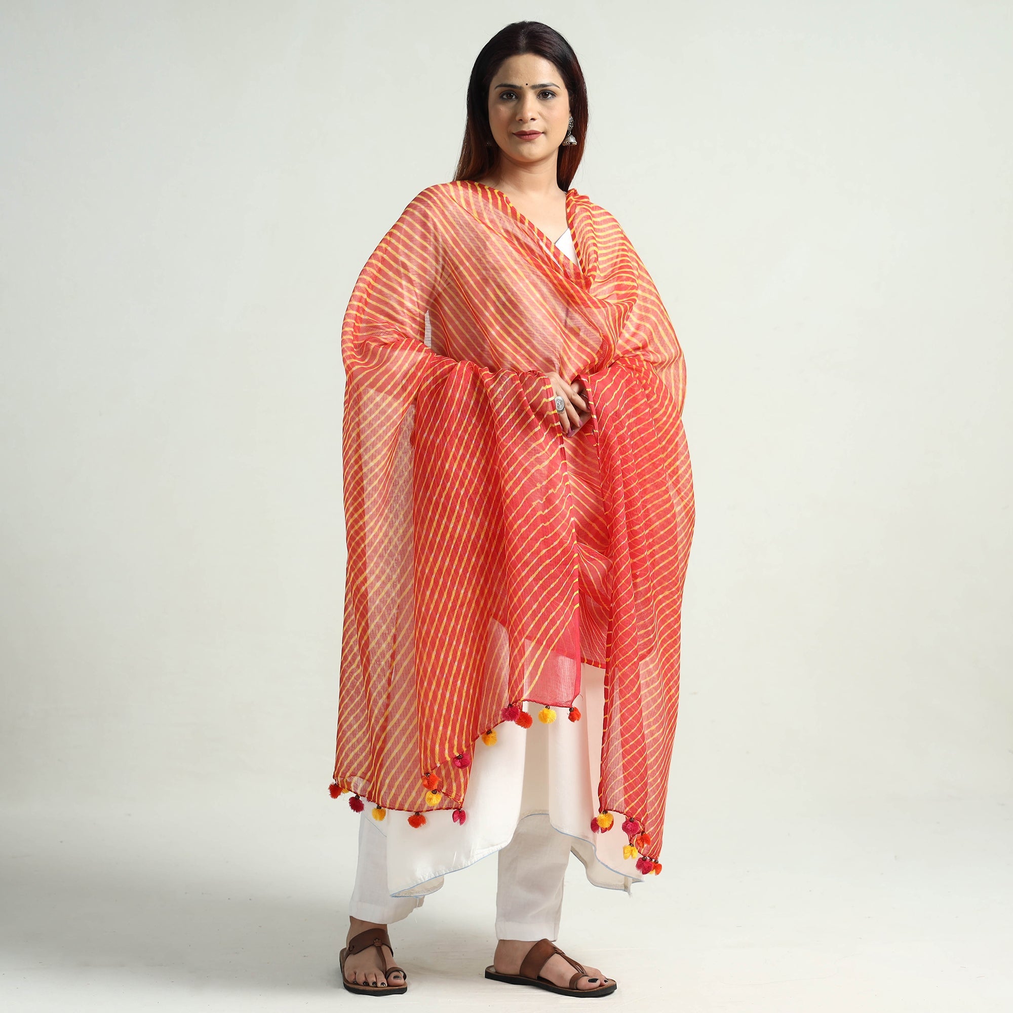 Elevate your style with this orange leheriya tie-dye kota doria cotton dupatta with tassels. Azo-free dye has been used to make this dupatta. The wavy patterns on this dupatta have been dyed using the leheriya tie & dye technique through a traditional process by the master artisan family of Badshah Miyan from the state of Rajasthan. Kota doria is a blend of strong cotton and lustrous silk yarns. The Doria, or threads, are finely interweaved to make the check patterns. Its lightweight and sheer texture gives an exquisite grace and elegance of its own. This dupatta is versatile and suitable for both formal and casual occasions, adding a touch of traditional Indian artistry to your style.