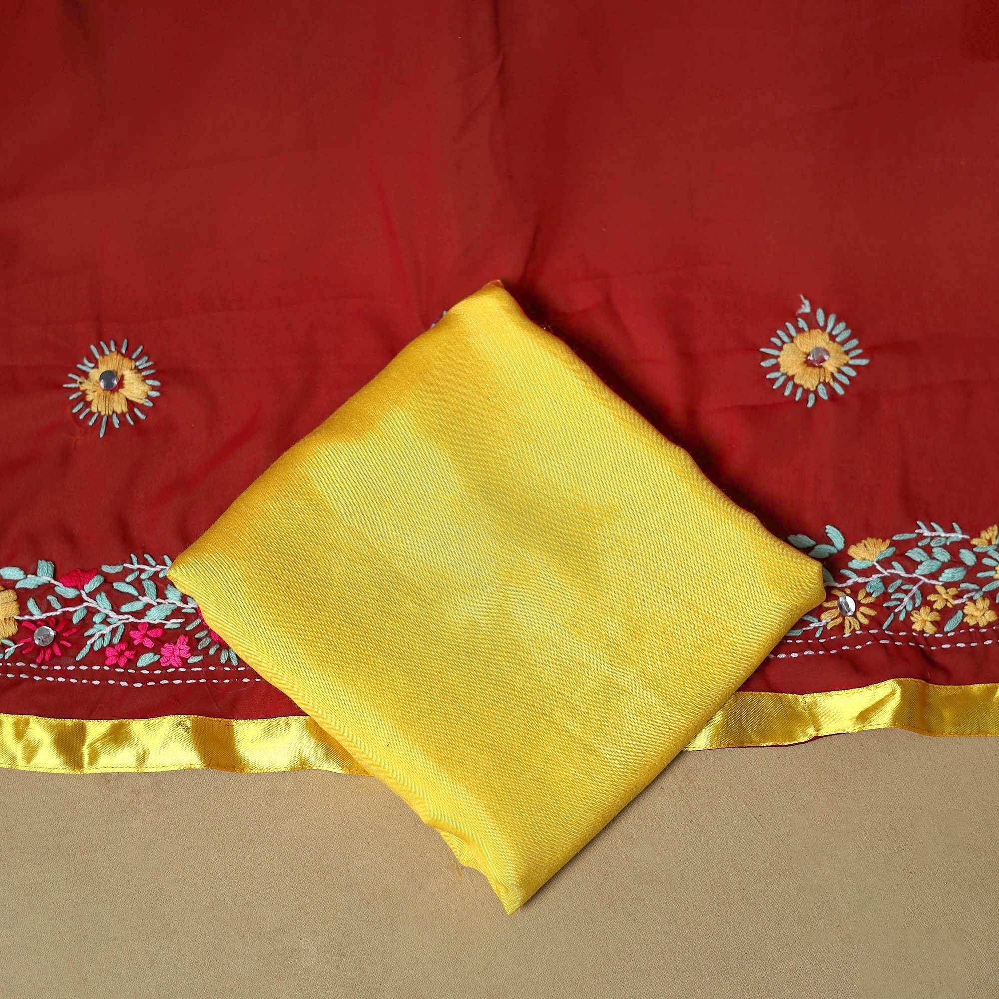 This maroon ranihati chapa work hand embroidered georgette 3pc suit material set includes a kurta, dupatta, and bottom. Each piece is beautifully hand-embroidered by skilled artisans, showcasing intricate designs and floral-inspired motifs. This suit material set allows you to unleash your creativity and craft a truly unique outfit.