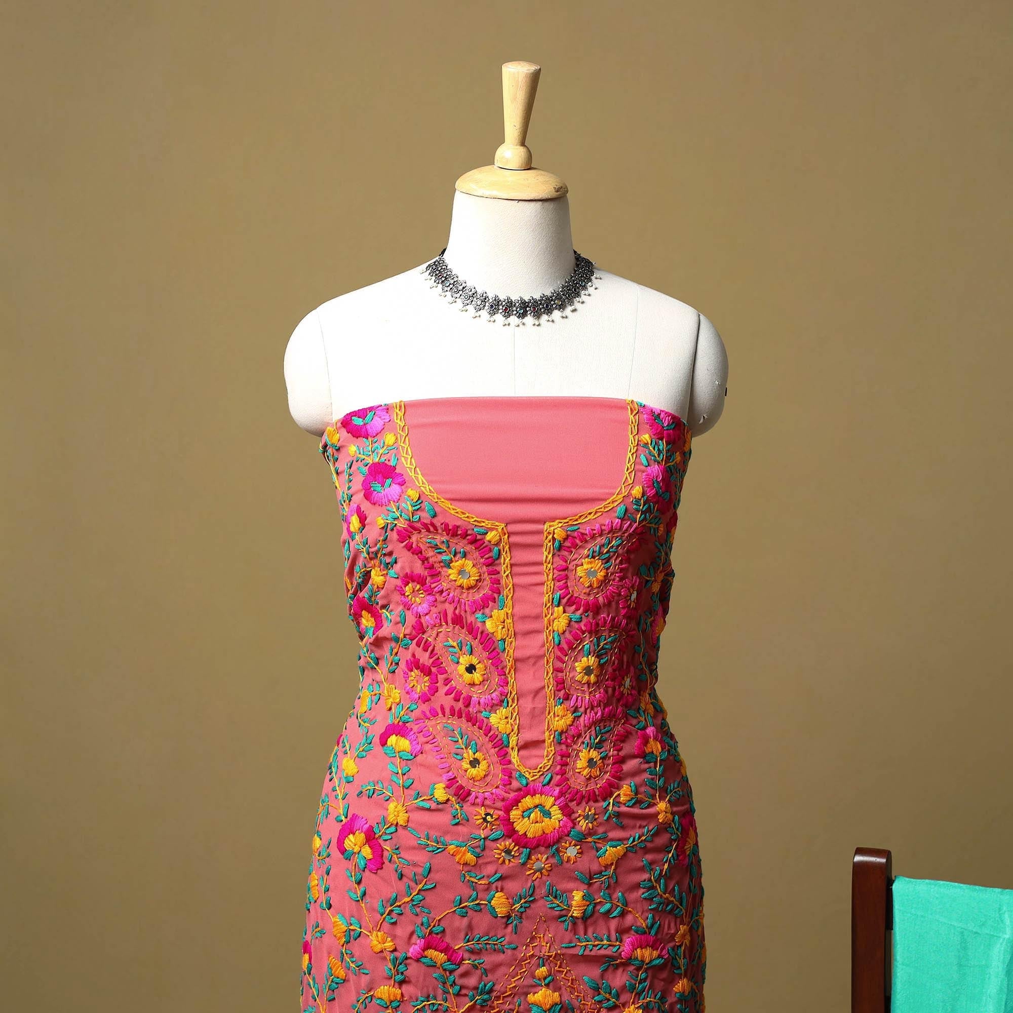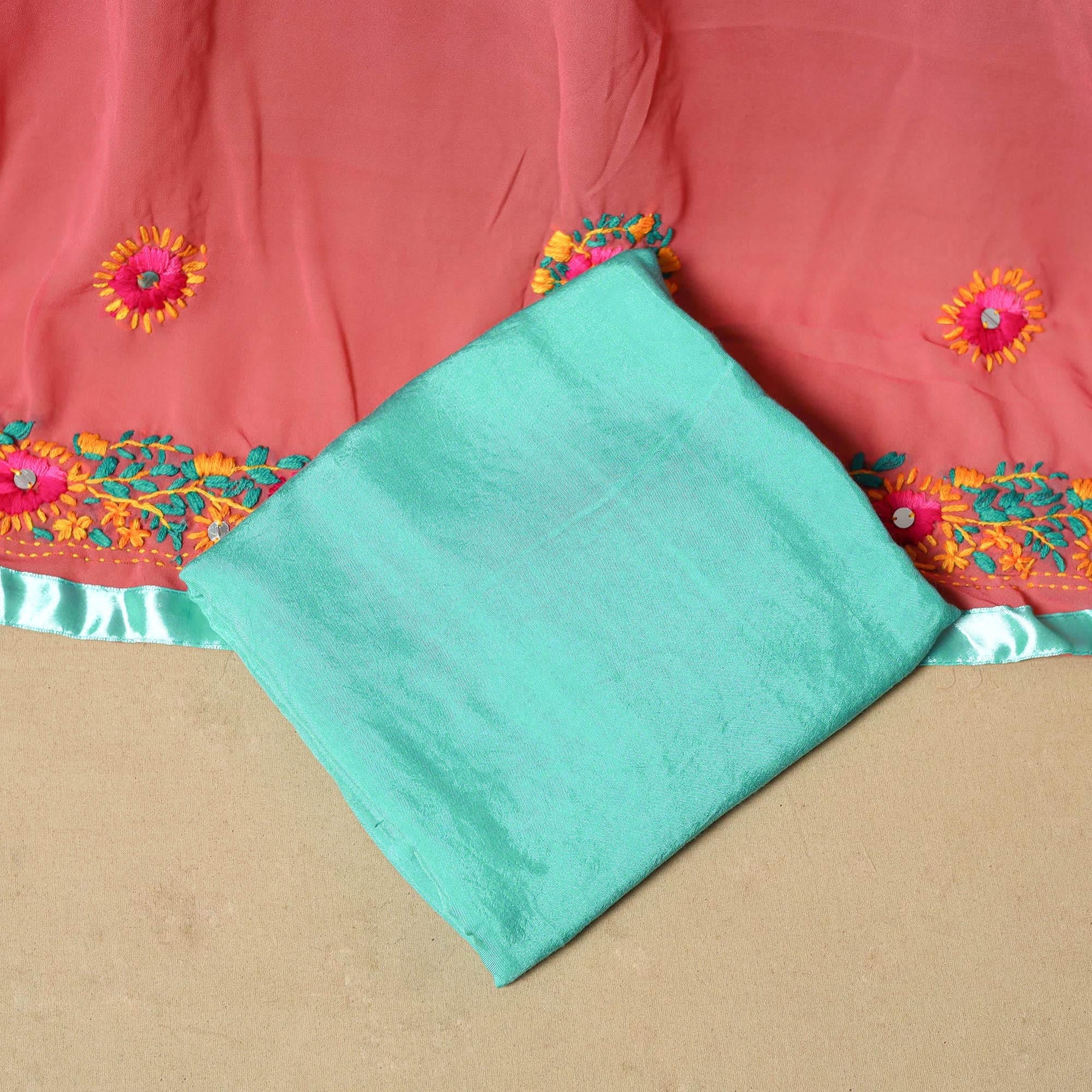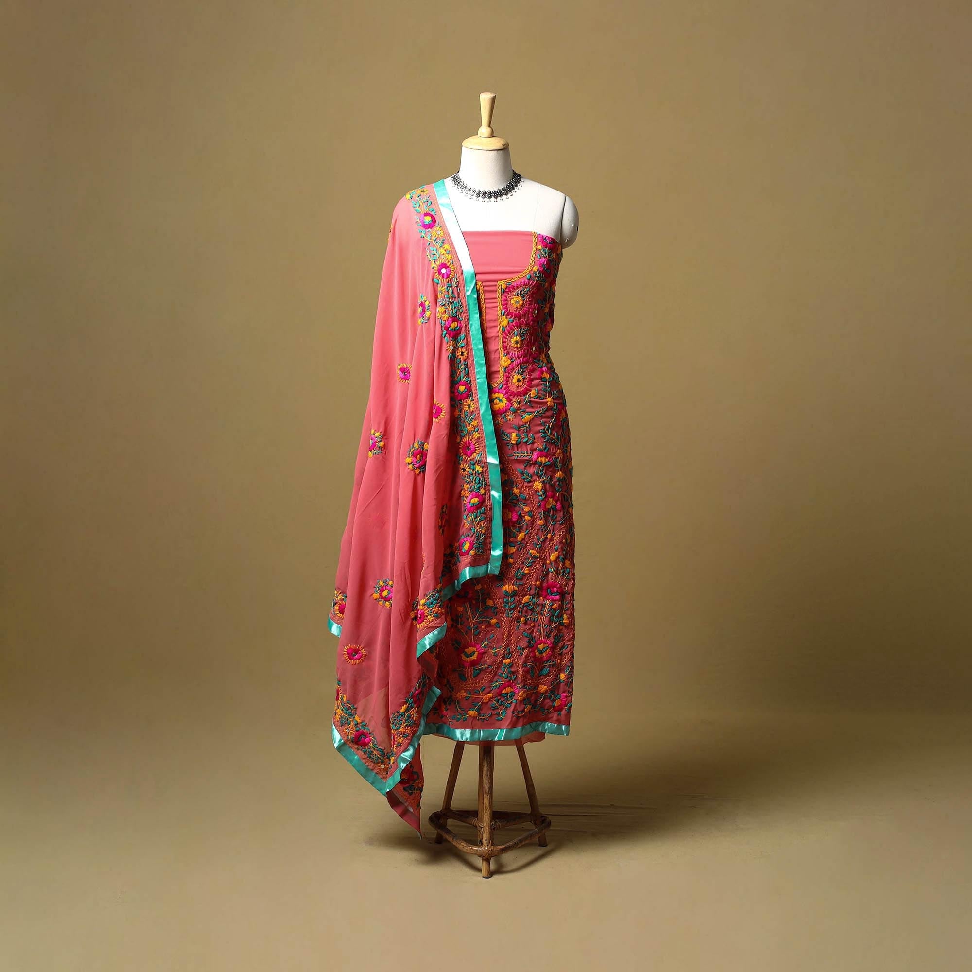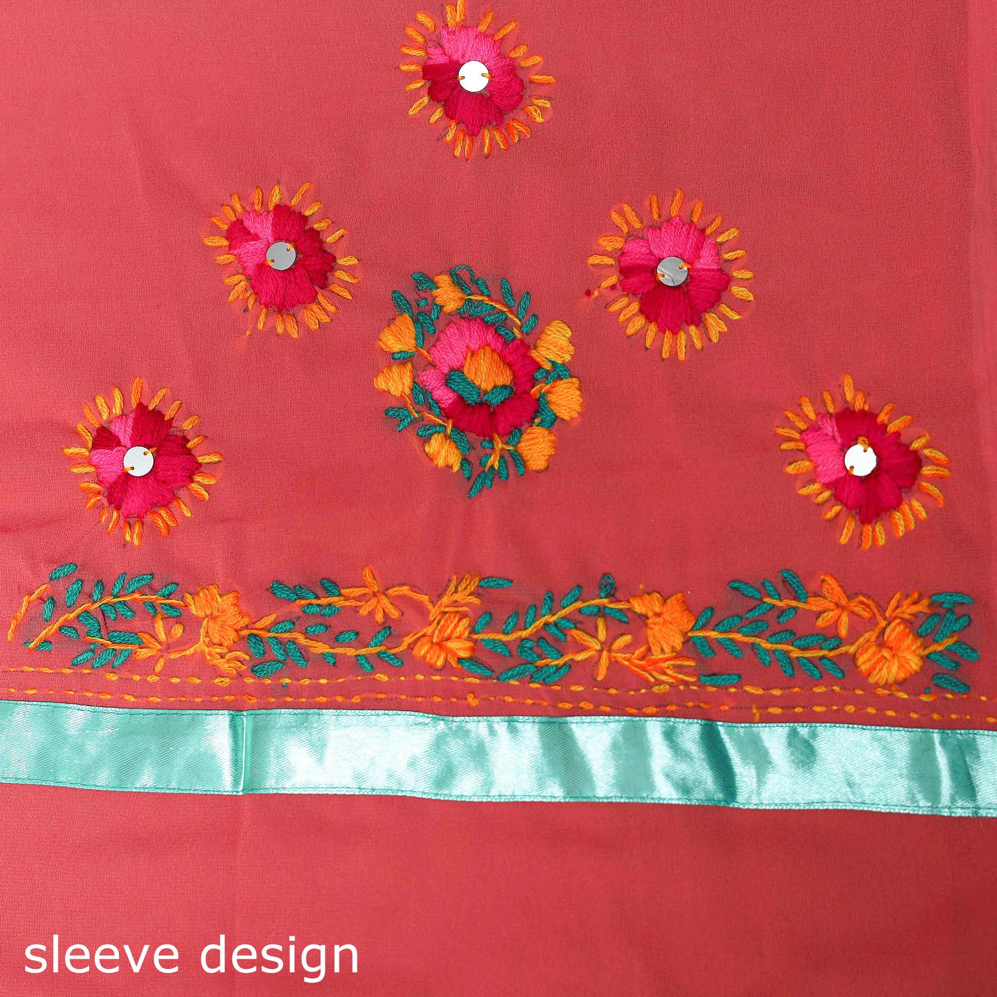 This red ranihati chapa work hand embroidered georgette 3pc suit material set includes a kurta, dupatta, and bottom. Each piece is beautifully hand-embroidered by skilled artisans, showcasing intricate designs and floral-inspired motifs. This suit material set allows you to unleash your creativity and craft a truly unique outfit.