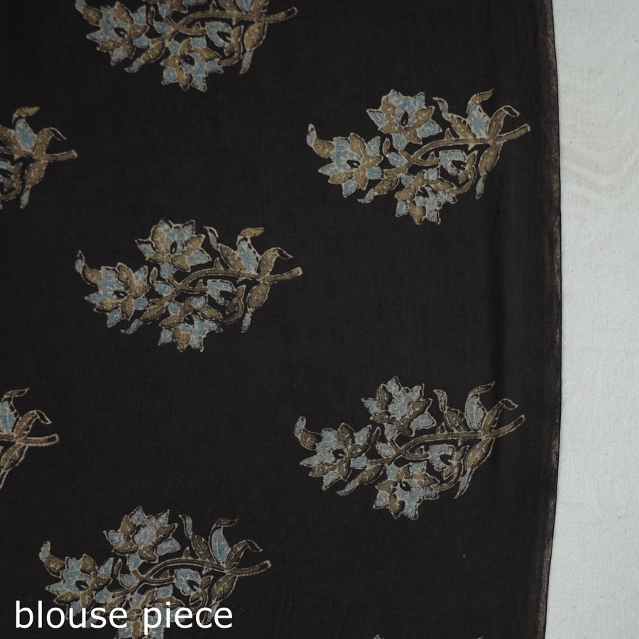 This brown natural dyed block print mul cotton ajrakh saree with blouse piece is made using natural dyes through the traditional technique of hand block printing practiced by Jabbar Khatri in the Kutch region of Gujarat. Ajrakh is a traditional vegetable dyeing and resist block-printing technique on cloth. It is estimated to be around 4,500 years old. The Ajrakh artisans in India are originally from Sindh, and they migrated to Kutch in Gujarat and Barmer in Rajasthan. Ajrakh is the traditional attire of the Maldhari pastoral community of Bhuj. The process of 'Ajrakh' is a long-drawn process with many stages, and each layer of color is printed after a gap of time, so the cloth has to stay for the day. This saree exudes cultural heritage and timeless beauty, making it a cherished addition to any wardrobe.